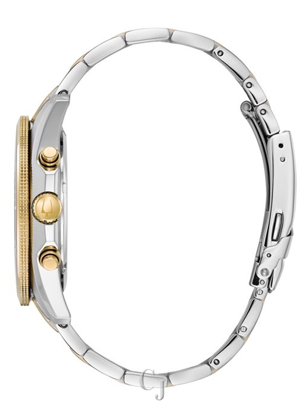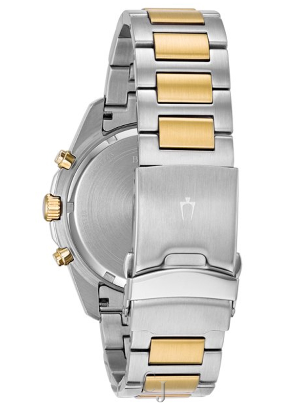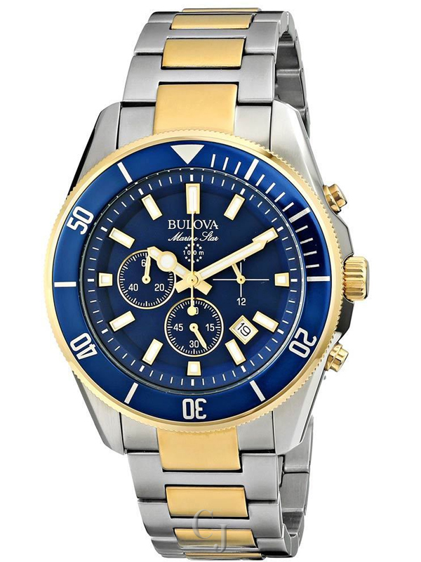 Bulova 98B230 men’s Marine Star blue dial two tone steel chronograph watch is offered, in a two tone yellow gold plated solid stainless steel case. This model is made in dimensions of 43mm across and 10mm high with a lug-to-lug measurement of 51mm. This watch has a fixed blue accented bezel and a textured screw down main crown with function pushers. Bulova 98B230 is fitted with a two tone yellow gold plated stainless steel bracelet. Securing the bracelet is a fold over push button safety clasp made in stainless steel. The dial is blue and it features tasteful sized, index hour markers and gold tone luminous mercedes shaped hands for optimum readability. Located on the flange is a minutes/seconds scale. Bulova 98B230 also features a chronograph, 12/24-hour time and date display window. This model has a mineral crystal for scratch resistance. Running this fine watch is a Japanese made quartz movement. The water resistance comes in at 100 meters.
