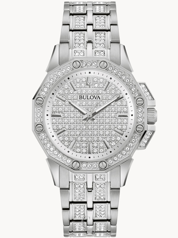 Make a striking style statement with the Bulova mid-size dress watch from the Octava Crystal collection. The silver-tone stainless steel case is set with the embellished silver-white and full pave 3-hand dial and features 345 sparkling hand-set crystals that adorn the timepiece and complete the bold look. The silver-tone stainless steel bracelet has a deployant buckle with pushers for easy fastening. This exquisite watch will enhance your day to evening look and make a refined statement.