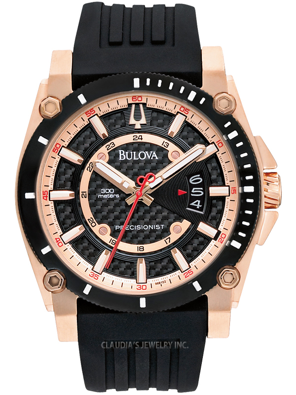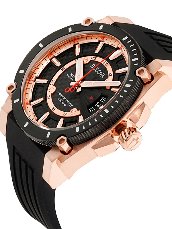 The Precisionist collection masterfully combines unparalleled accuracy to seconds per year, continuous-sweep second hand and intricate details for timeless style. In stainless steel with black and rose-gold ion plated finish, curved crystal, multiple-layer black carbon fiber, black and rose-gold dial, continuously sweeping second hand, luminous hour and minute hands, luminous markers, curved calendar window, 24-hour track, screw-back case, screw-down crown, and patterned black rubber strap. Powered by Bulovas proprietary three-prong quartz crystal Precisionist movement with a 262kHz vibrational frequency–eight times greater than standard quartz watches–for unparalleled accuracy.