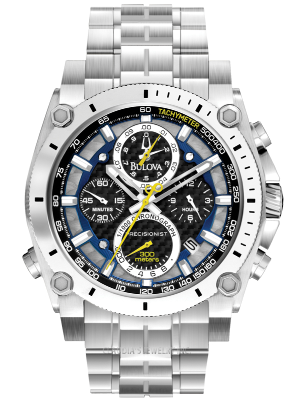 From the Precisionist Collection with precise timing to 1/1000th of a second and continuous-sweep second hand, the Precisionist Chronograph is particularly refined. In stainless steel with curved crystal, multiple-layer black carbon fiber, blue, silver and black dial, yellow second hand, luminous hour and minute hands, luminous markers, calendar, screw-back case, screw-down crown, and secure double-press fold-over clasp with safety lock. Powered by Bulovas proprietary three-prong quartz crystal Precisionist movement with a 262kHz vibrational frequency–eight times greater than standard quartz watches–for unparalleled accuracy.