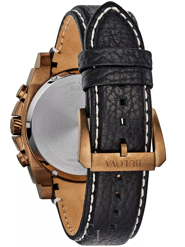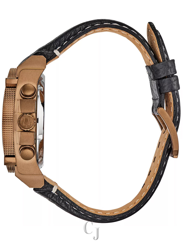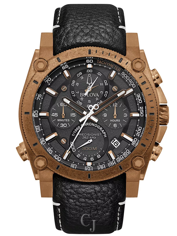 Powered by Bulova’s proprietary Precisionist eight-hand quartz chronograph movement with a 262kHz vibrational frequency, eight times greater than standard timepieces, for unparalleled accuracy. Distressed Bronze Tone IP case with black dial featuring bronze-tone accents, curved mineral crystal, a black leather strap with contrast topstitching, and three-piece buckle closure. 300-meter water resistance.