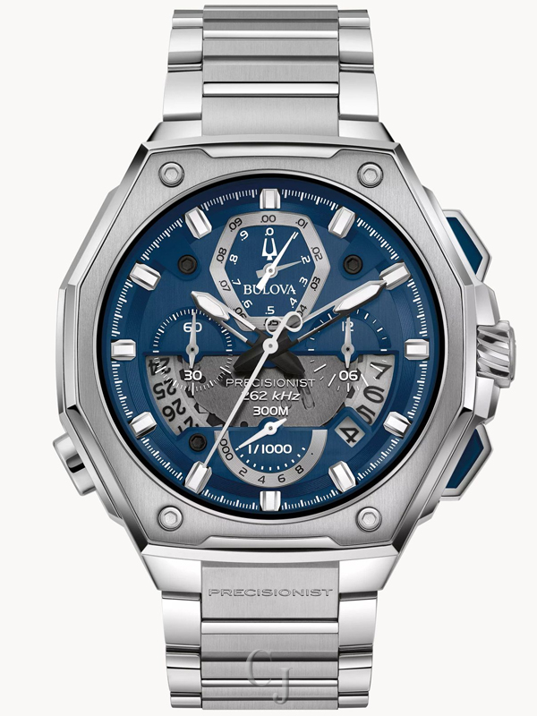 Since its 2010 debut, Precisionist exhibited advanced timekeeping at its best – fusing distinctive bold architectural design with state-of-the-art proprietary 262kHz movement. 2020 celebrates 10 years of the Precisionist technology and reinvents the Precisionist aesthetic with a revolutionary new design. With its proprietary high performance movement and continuous-sweep second hand, It features a silver-tone stainless steel case, paired with a blue dial and silver-tone stainless steel bracelet. In addition, it features a calendar and twelve-hour chronograph with precise timing to 1/1000th of a second and continuous-sweep second hand for a perfect pairing of form and function. Luxury, performance, and history — the Precisionist is a perfect union of innovative technology and design – a discerning timepiece for the ages