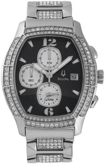 Bulova Crystal Collection Featuring the stunning beauty of 268 genuine Swarovski crystals, the silver-tone stainless steel Men’s Crystal Chronograph Watch from Bulova showcases elegant artistry and fine materials. A dramatic black dial luminous hands, three subdials, and Roman numerals at the six and 12 o’clock positions. There’s also a convenient date display at three o’clock, and an alarm. Quartz movement ensures reliability, while a hidden deployment clasp on a polished stainless steel case allows for secure wear and easy on/off. Water resistant 30 meters/100 feet.