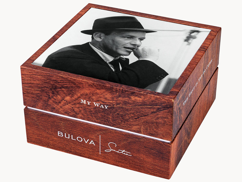 Incorporating vintage Bulova designs with the unmistakable elements of legendary performer, Frank Sinatra, the ‘Fly Me To The Moon’ watch features a gold-tone stainless steel case with gold-tone vintage style hands and markers. Frank Sinatra’s signature is displayed elegantly on the textured silver white dial. The watch features a Miyota Caliber 8215 21-jewel automatic movement with a 42-hour power reserve and calendar. The exhibition case back showcases the fine movement and features the song title as well as the iconic Fedora Hat, which can also be found etched on the crown. The black lizard grain textured leather strap features a deployant buckle and is stamped with the name ‘Fly Me To The Moon’ along the inside. The watch features a domed sapphire crystal with AR coating and water resistance to 30 meters.