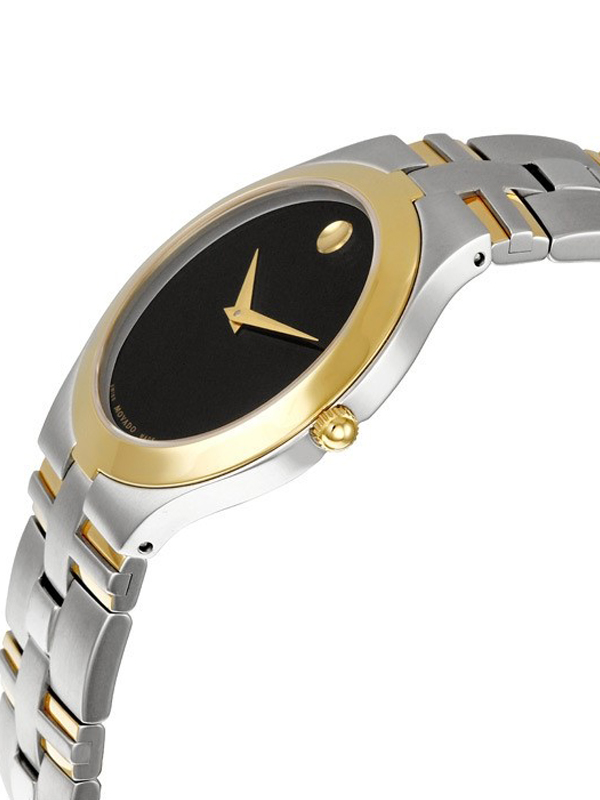 Silver-tone stainless steel case two-tone silver-tone and gold-tone stainless steel bracelet. Fixed gold-tone stainless steel bezel. Black dial with gold-tone hands. No markers. the signature movado dot appears at the 12 o’clock position. Dial Type: Analog. Quartz movement. Scratch resistant sapphire crystal. Pull-push crown. Solid case back. Round case shape, case size: 35.5 mm, case thickness: 6.5 mm. Hidden deployment clasp. Water resistant at 30 meters / 100 feet.