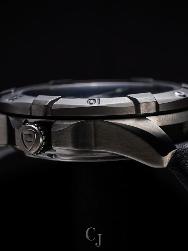 - 42mm 316L Stainless Steel Case with IP Gun Metal Gray Plating and Embossed Screw Caseback. Weight: 96.7 grams. Case Thickness: 13mm.