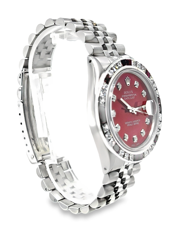Discover unparalleled craftsmanship with the Rolex Datejust Ref. 16030, a luxurious timepiece featuring a 36mm stainless steel case and a custom 14KT white gold bezel set with 24 princess-cut diamonds and 12 rubies. Its captivating red dial is adorned with diamond hour markers, offering elegance and clarity. The automatic movement ensures precision, while the stainless steel Jubilee bracelet with a traditional Rolex clasp provides timeless sophistication. Water-resistant to 100 meters and safeguarded by scratch-resistant sapphire crystal, this Rolex is an exemplary blend of durability and exquisite design. Available in very good condition with a box, this unisex Datejust is the quintessence of Rolex’s legendary horological excellence.