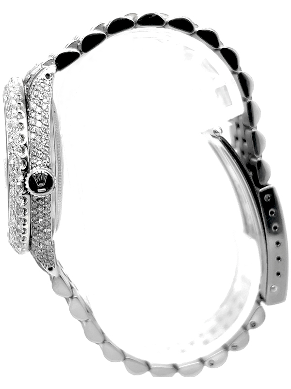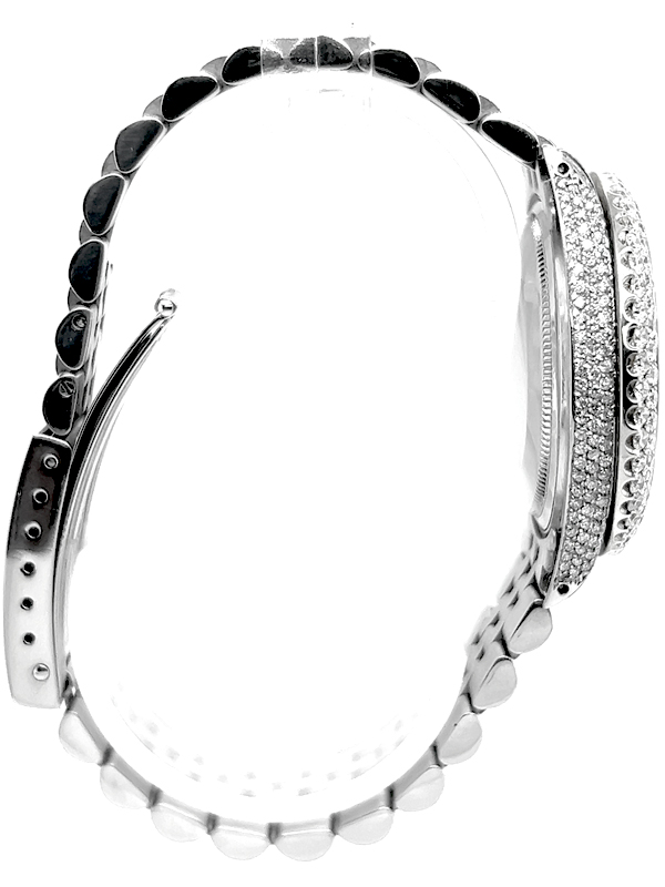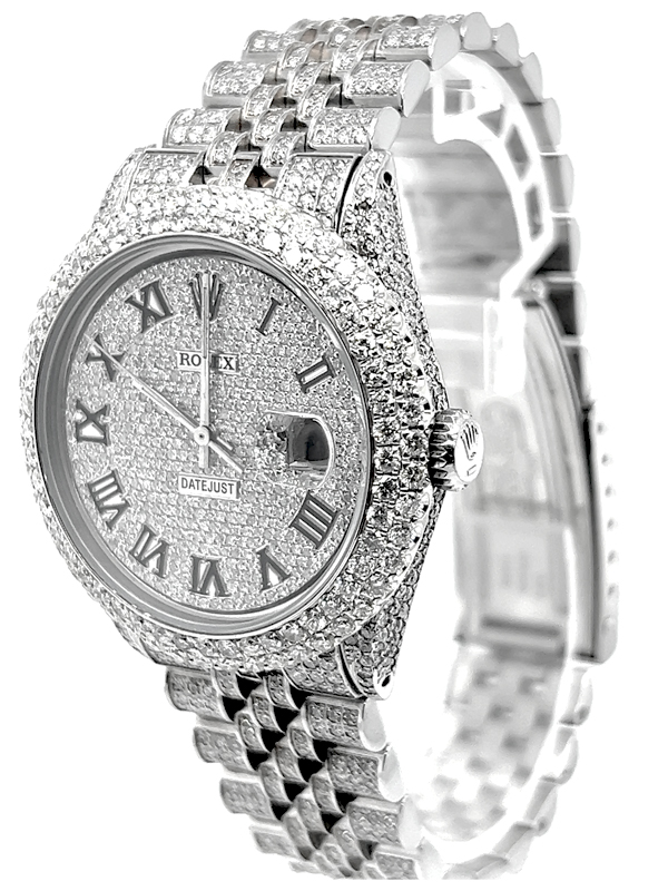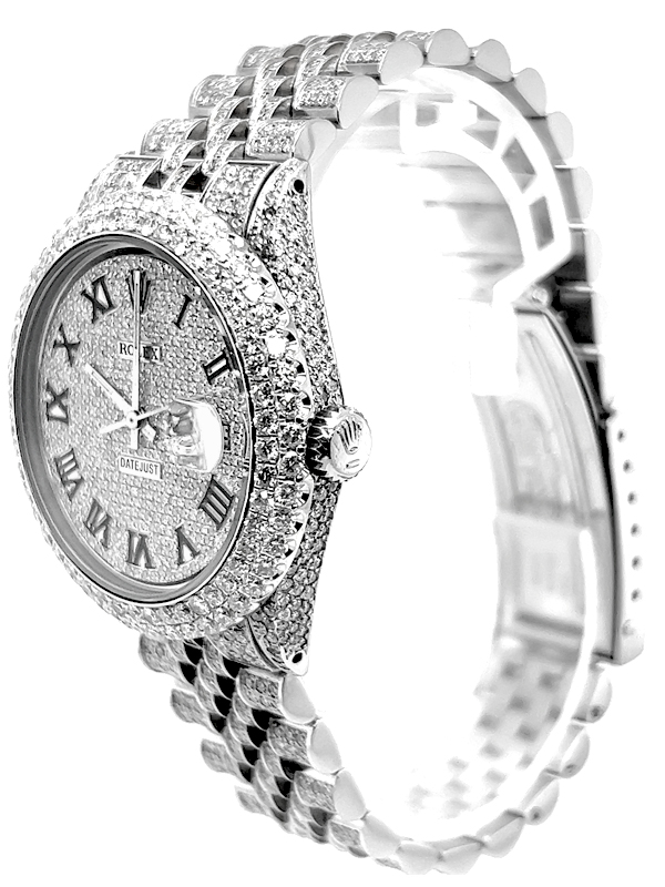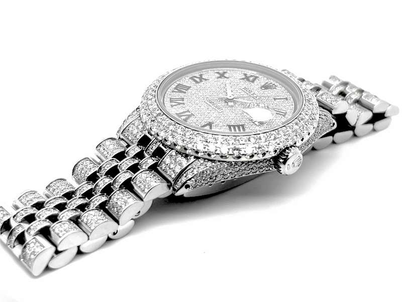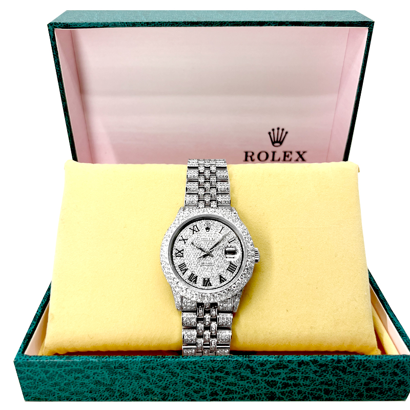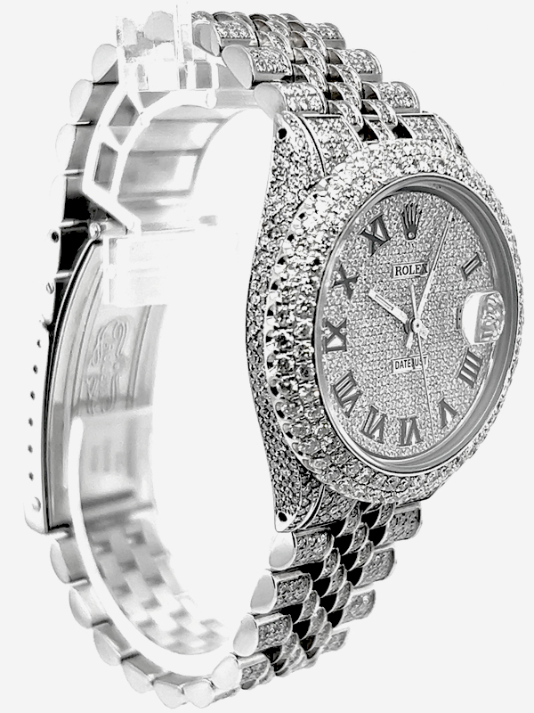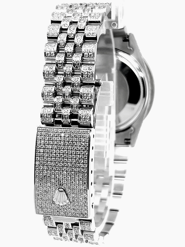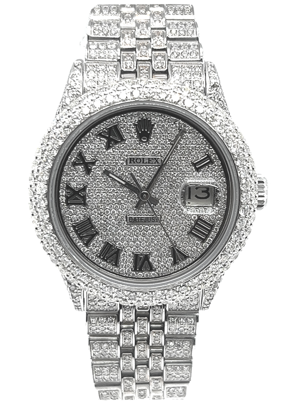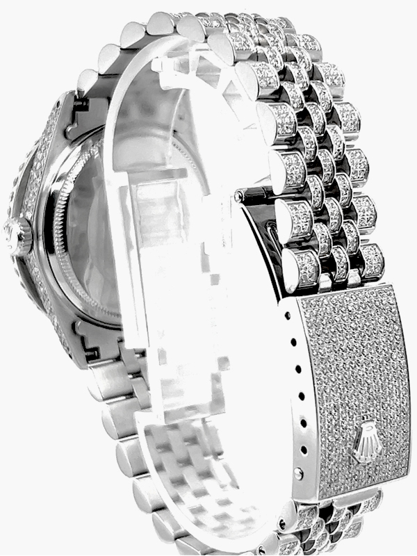 Rolex datejust diamond Stainless Steel watch model reference 1603, Featuring a 36mm Stainless Steel case ,Custom Full Diamond Roman Numerals Dial with a date aperture at 3 o’clock and an external cyclops,Stainless Steel Jubilee custom Bracelet Set With Genuine Diamonds and Custom Diamond Bezel.