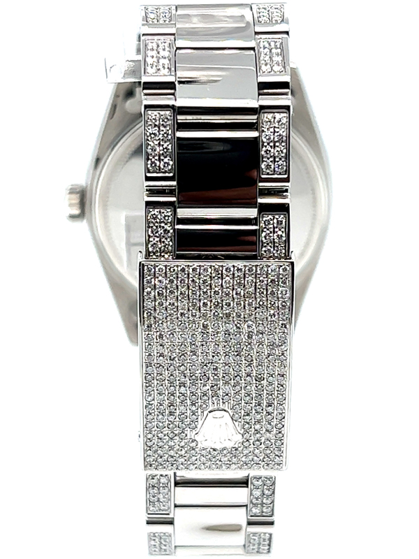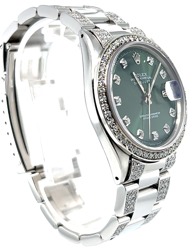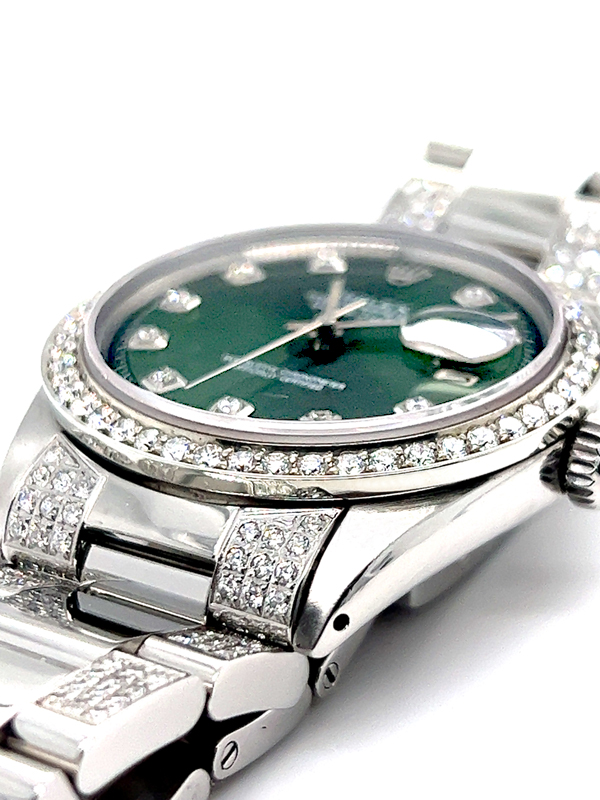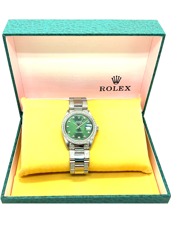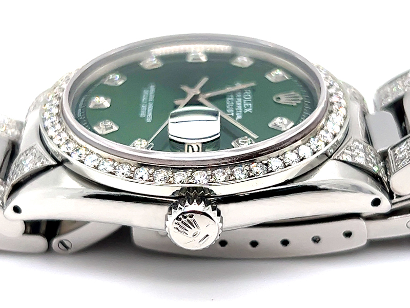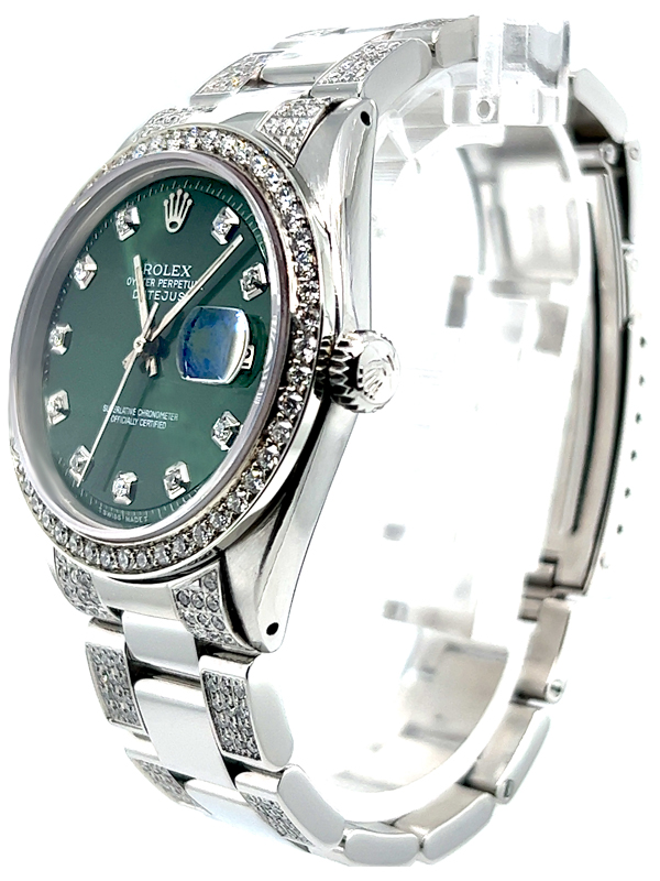 Rolex datejust diamond watch model reference 1603 , Featuring a 36mm Stainless Steel case , housing a Green diamond dial with a date aperture at 3 o’clock and an external cyclops, Oyster Bracelet Set With Custom Genuine Diamonds and Custom Diamond Bezel.