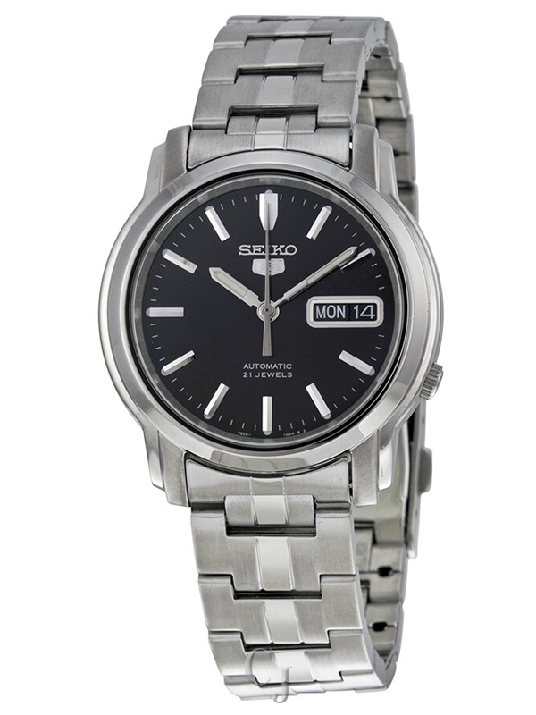 Stainless steel case with a stainless steel bracelet. Fixed stainless steel bezel. Black dial with luminous silver-tone hands and index hour markers. Minute markers around the outer rim. Dial Type: Analog. Luminescent hands and markers. Day of the week and date display at the 3 o’clock position. Seiko caliber 7S26 automatic movement with a 40-hour power reserve. Scratch resistant Hardlex crystal. Pull / push crown. Skeleton case back. Round case shape. Case size: 38 mm. Case thickness: 11 mm. Band width: 17.5 mm. Deployment clasp. Water resistant at 30 meters / 100 feet. Functions: date, day, hour, minute, second. Dress watch style. Watch label: Japan Movt. Seiko 5 Automatic Black Dial Stainless Steel Men’s Watch SNKK71.
