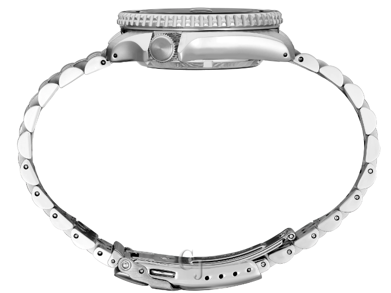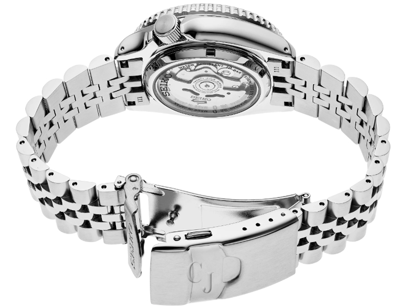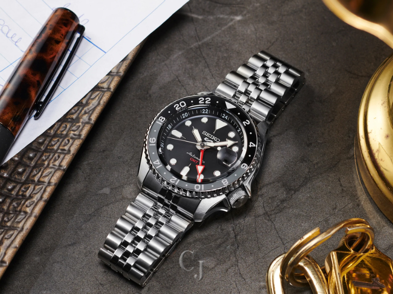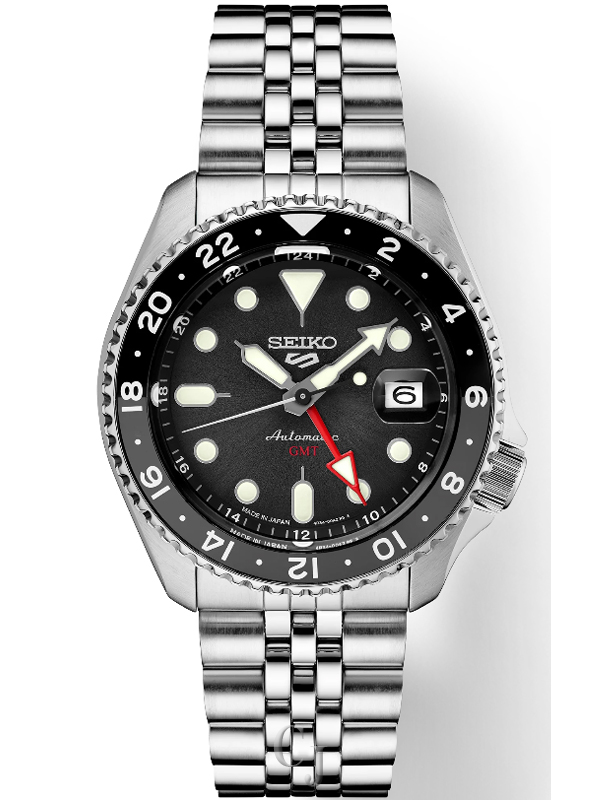 Seiko 5 Sports SKX Sports Style GMT Series, Design of the case and bracelet inspired by one of Seiko’s best-loved sports watches, known to enthusiasts as the Seiko SKX series, Automatic GMT with manual winding capability, 21,600 vibrations per hour, Power reserve: approximately 41 hours, 24 jewels, Black and gray 24-hour GMT bezel, Black dial, Magnified date calendar, Luminous hands and markers, Large GMT hand for improved visibility and legibility, Screwdown see-through caseback, Case diameter: 42.5mm, Stainless steel case and stylized five-row bracelet, Tri-fold push button release clasp with lock, Water-resistant to 10 bar, 100 meters (330 feet), Caliber 4R34