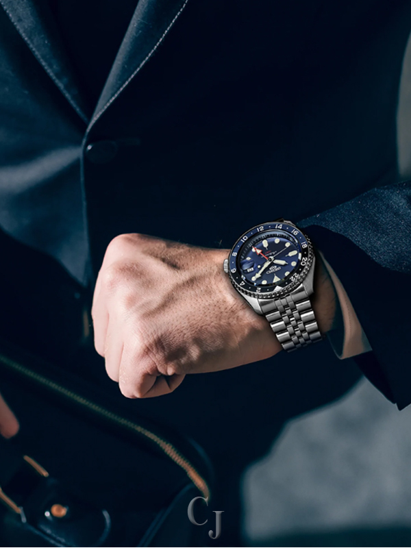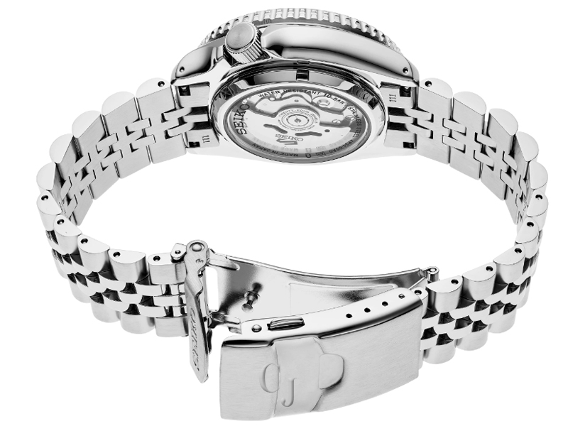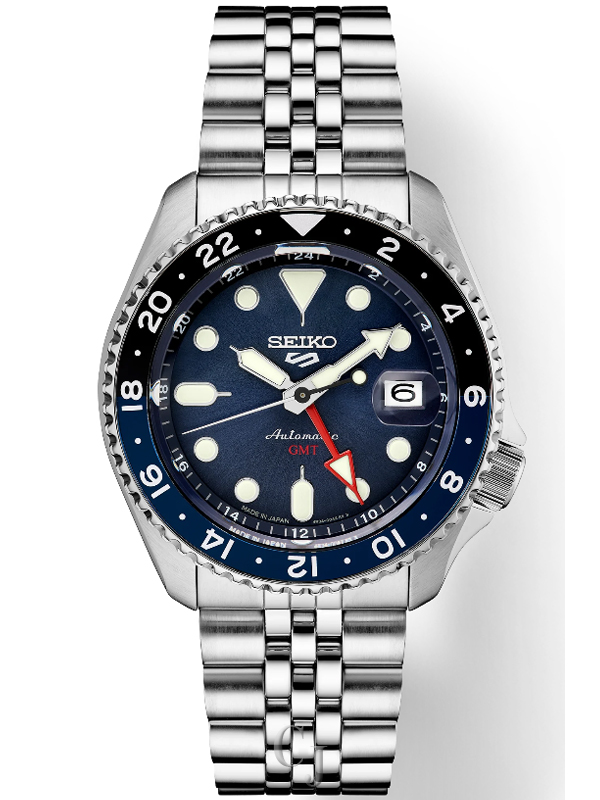 Seiko 5 Sports SKX Sports Style GMT Series, Design of the case and bracelet inspired by one of Seiko’s best-loved sports watches, known to enthusiasts as the Seiko SKX series, Automatic GMT with manual winding capability, 21,600 vibrations per hour, Power reserve: approximately 41 hours, 24 jewels, Blue and black 24-hour GMT bezel, Blue dial, Magnified date calendar, Luminous hands and markers, Large GMT hand for improved visibility and legibility, Screwdown see-through caseback, Case diameter: 42.5mm, Stainless steel case and stylized five-row bracelet, Tri-fold push button release clasp with lock, Water-resistant to 10 bar, 100 meters (330 feet), Caliber 4R34