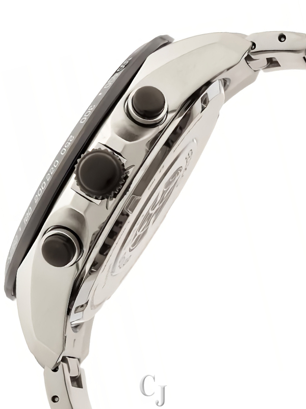 Two-tone stainless steel and ceramic Bracelet. stainless steel case. black ceramic bezel. black dial with Silver hands index hour markers. chronograph world time. solar movement. sapphire crystal. 45mmx 45mmx 18mm case. 24mm band width. 100 meters water resistant. SSE029