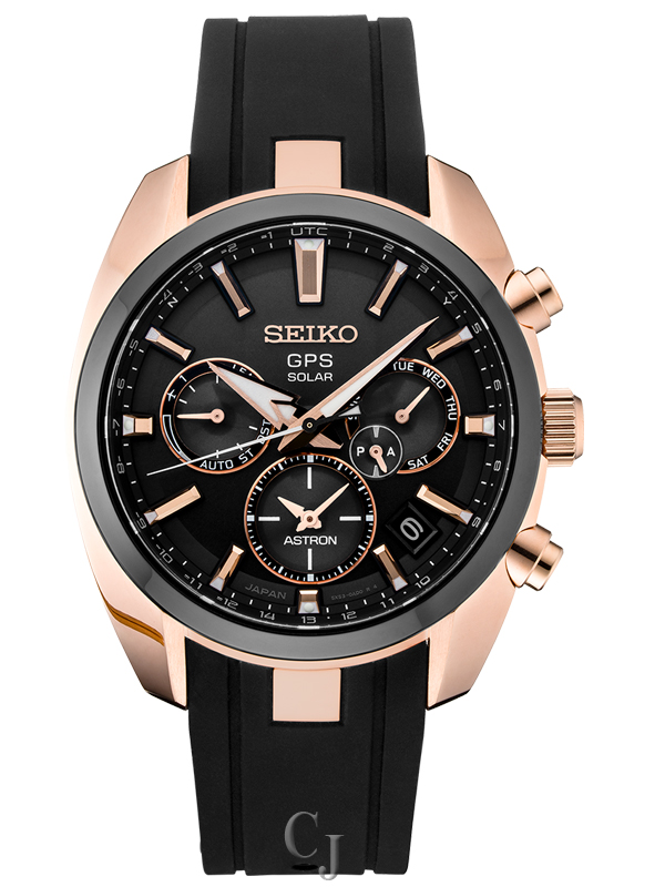 Astron Solar GPS Dual Time. A revolution in precision timekeeping. Fifty years ago, Seiko transformed watchmaking with the first commercially available quartz watch, the Astron. Today, Seiko takes another step forward with the new Astron, reflecting the strong, sleek lines of the 1969 original, while providing the highest degree of accuracy possible in a wristwatch — effortlessly. GPS controlled for high-speed time and time zone adjustment to 39 time zones, with daylight saving time function, this remarkable timepiece includes a perpetual day and date calendar correct to the year 2100, dual time with time transfer function, and am/pm indicators. The magnetic resistance is 4,800A/m and, to ensure smooth operation, the watch is equipped with a signal reception result indicator and power save function. The solar cell is powered by light energy, with no battery change required. The rich black dial, with rose-gold accents, also features a date calendar and LumiBrite hands and markers, and is topped by a dual-curved sapphire crystal with super-clear coating. Crafted of stainless in rose-gold finish, with a super-hard coating for added durability, secure screwdown caseback, and extra strength silicone strap with tri-fold push button release clasp. 10 bar, 100m Water Resistant.