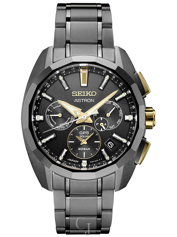 Astron Kintaro Hattori Titanium Limited Edition. Fifty years ago, Seiko transformed watchmaking with the first commercially available quartz watch, the Astron. Today’s Astron Titanium Collection represents another step forward, reflecting the strong, sleek lines of the 1969 original, in light and durable titanium, while providing the highest degree of accuracy possible in a wristwatch — effortlessly. Available only in a single run of 2,500, with serial numbers engraved on each caseback, this extraordinary Limited Edition pays tribute to Seiko founder, Kintaro Hattori, on the 160th anniversary of his birth, with a gold caseback engraved with the circle and square “S” 1900 company trademark, the name Kintaro Hattori and his motto, “One Step Ahead of the Rest.” Also commemorating this important birthday are the 16 facets of the black zirconia ceramic bezel, one for each decade. GPS controlled for high-speed time and time zone adjustment to 39 time zones, this remarkable timepiece includes a daylight saving time function, perpetual day and date calendar correct to the year 2100, dual time with time transfer function, and am/pm indicators. To ensure smooth operation, the watch is equipped with a signal reception result indicator and power save function. The solar cell is powered by light energy, with no battery change required. The rich black dial also features a date calendar and LumiBrite hands and markers, and is topped by a dual-curved sapphire crystal with super-clear coating. Crafted of stainless steel with a black super-hard coating for added durability, secure screwdown caseback, additional black crocodile strap* and tri-fold push button release clasp. 20 bar, 200M Water Resistant.