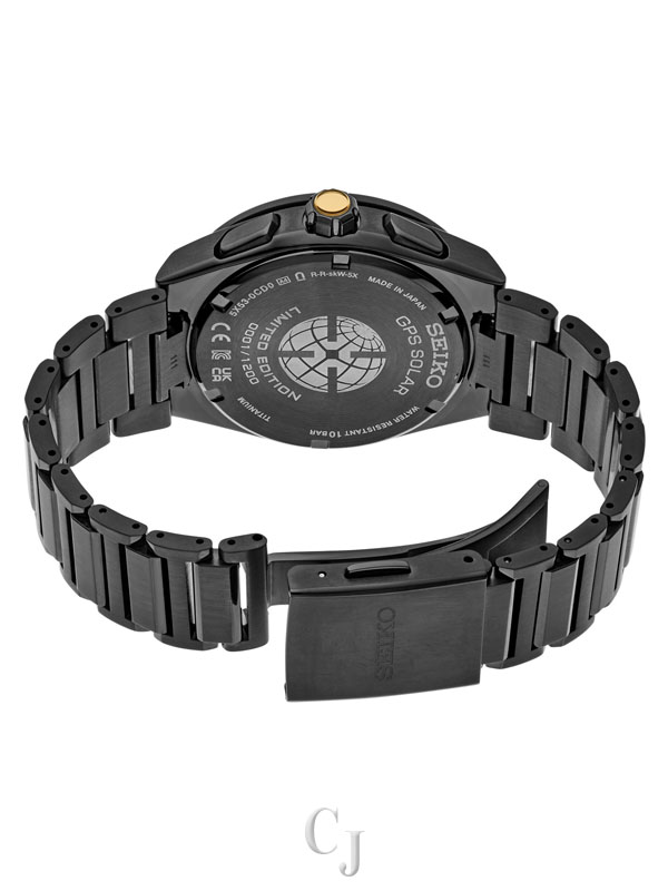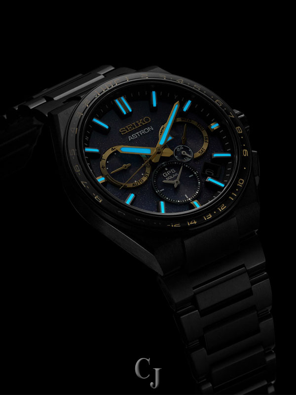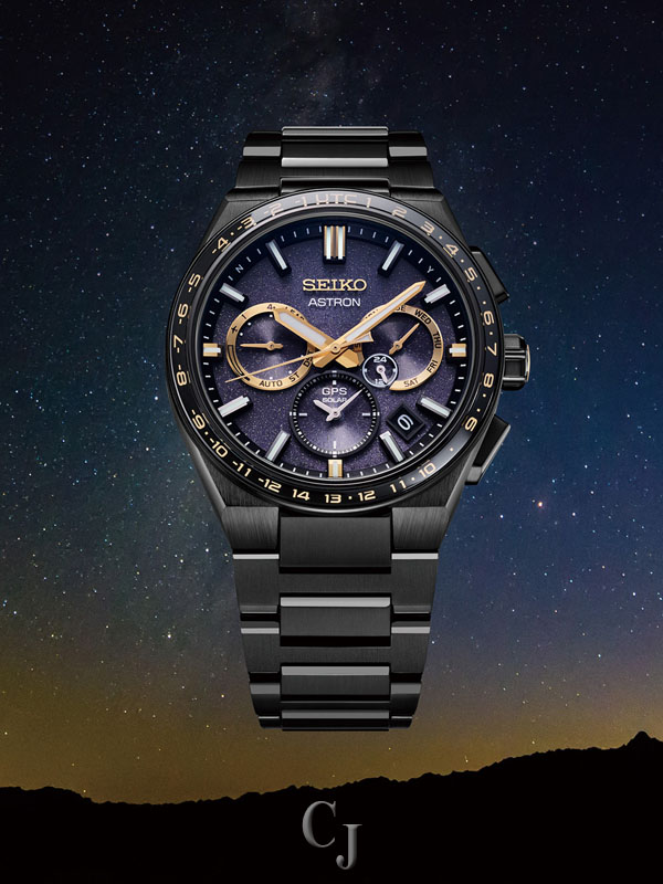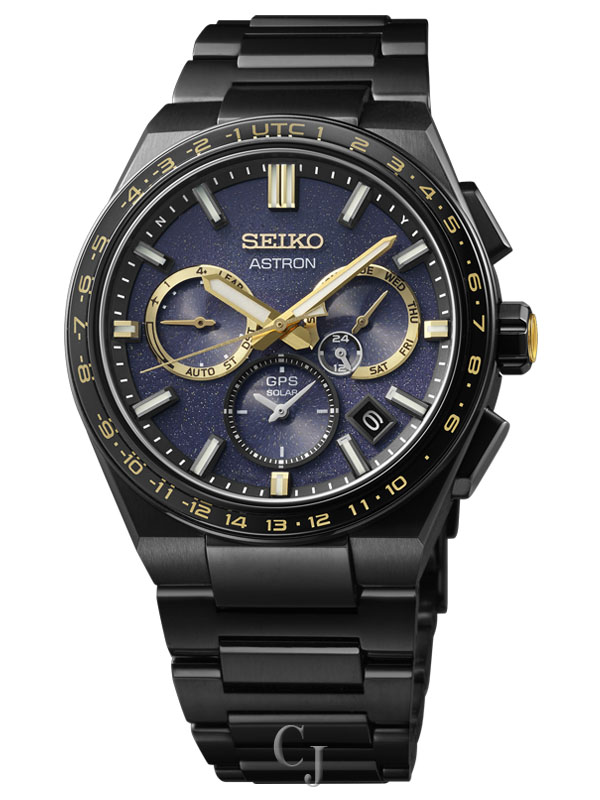Astron GPS Solar Limited Edition. With the strong, sleek lines of the Seiko Astron, the world’s first commercially available quartz watch, today’s Astron is designed for a new generation of leaders, breaking through to the future with excellence in both innovation and style. Drawing inspiration from the theme of space and stars evoked by the name Astron, this distinctive limited edition is inspired by the radiance of Venus and other planets and stars in the early morning sky, as expressed by the glittering blue gradations and gold accents of the dial. Available only in a controlled-production run of 1,000, with the serial number engraved on each caseback, this exceptional watch combines solid tailoring with the highest degree of accuracy possible in a wristwatch. GPS controlled for high-speed dual time and time zone adjustment to 39 time zones, the solar dual time movement includes an AM/PM indicator, daylight saving time function, time transfer function, power save function, and perpetual day/date calendar correct to the year 2100. The solar cell is powered by light energy, with no battery change required. The unique pressed pattern dial features dual time, day, 24-hour and multi-function indicator subdials, a date calendar, and LumiBrite hands and markers, and is framed by a bezel with a blue sapphire crystal insert. Crafted of light and durable titanium with black super-hard coating to highlight the rich blue dial, this superb timepiece also offers a sapphire crystal with super-clear coating, secure screwdown caseback and tri-fold push button release clasp. 10 bar, 100M Water Resistant.
