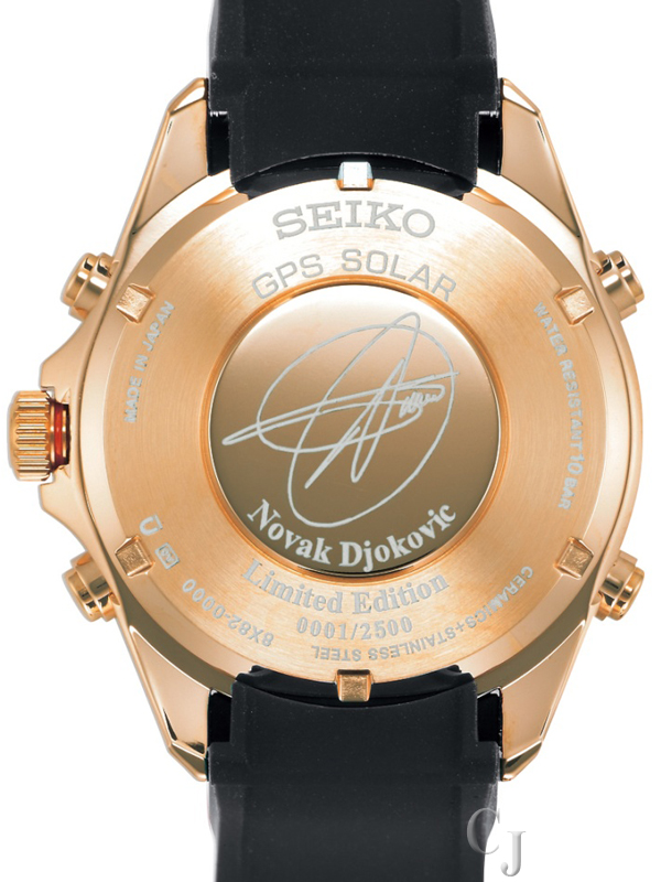 The Novak Djokovic Limited Edition features black ceramic bezel, an extra-strength silicon strap and the rose-gold tone of the steel case. The case back carries Novak’s name and signature with each watch’s own serial number engraved beneath. The Novak Djokovic Astron GPS Solar