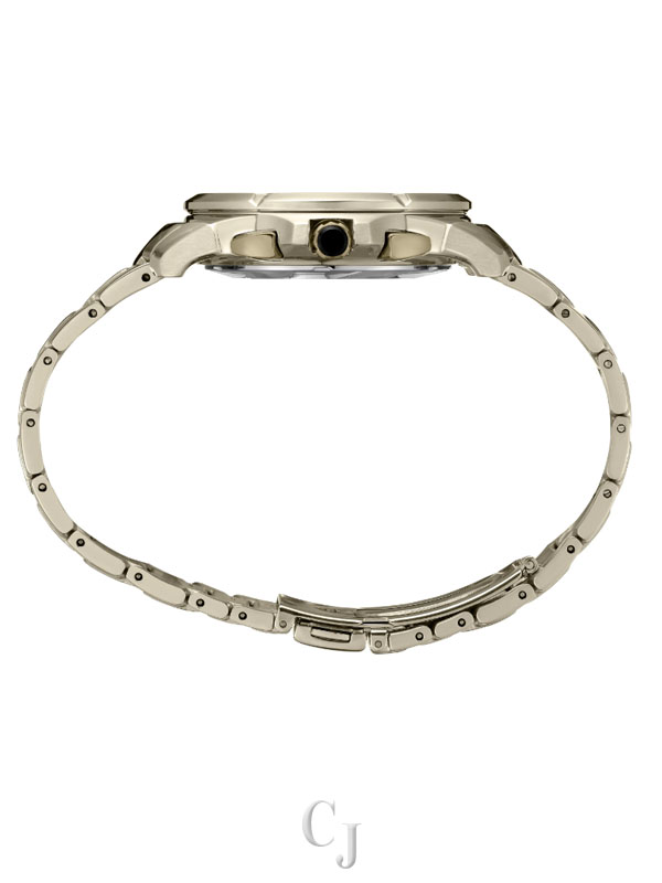 From the Coutura Collection. Delivering the perfect blend of technology and design for those on the move, the Coutura Collection combines bold angularity and shading with superior timekeeping for effortless sport/dress style. Inspired by motor sports, with a new case and bracelet design incorporating the angles and edges of racecar architecture, this dashingly sculpted chronograph features a multi-layer carbon-fiber patterned black dial with prominent 24-hour and chronograph minutes subdials at 3 and 9 o’clock styled to suggest a dashboard, tachymeter outer ring, date calendar, red chronograph hand, and LumiBrite hands and markers. Applied markers and subdial rings add a rich dimensionality, while the grooved bezel provides a sense of propulsive action. Crafted of stainless steel in a light gold finish, this dynamic watch includes a sapphire crystal, screwdown caseback, tri-fold push button release clasp and classic cabochon crown. The chronograph function offers timing to 60 minutes in 1/5-second increments with split time measurement. 10 bar, 100M Water Resistant