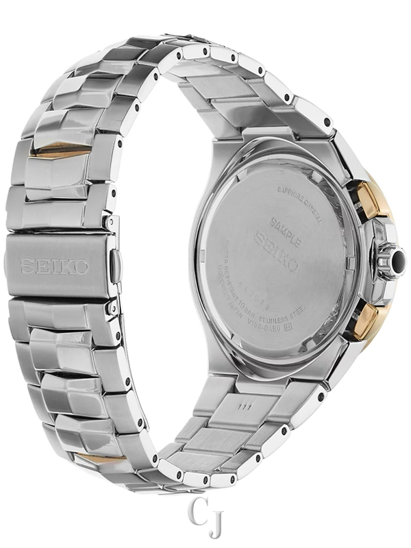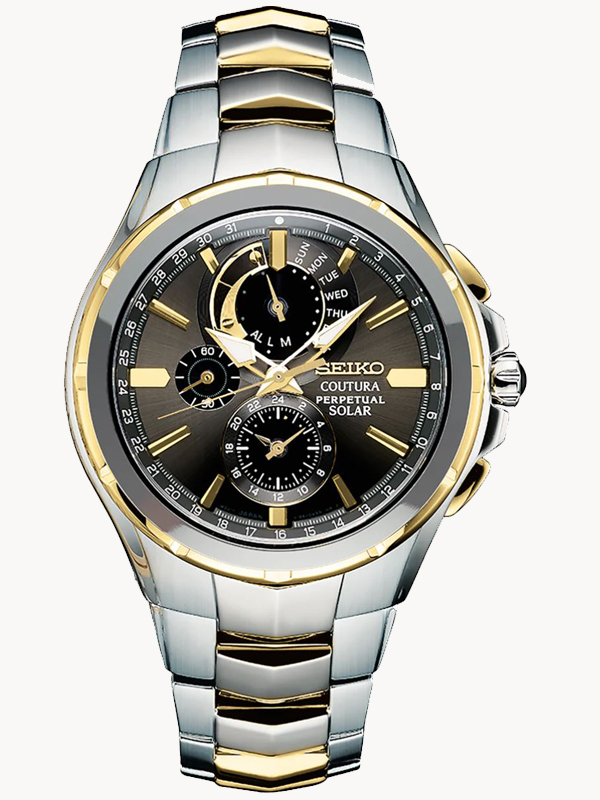 Stainless steel case with a stainless steel bracelet with yellow gold-tone links. Fixed stainless steel and yellow gold-tone bezel. Black dial with luminous yellow gold-tone hands and index hour markers. Minute markers. Date scale around the outer rim. Dial Type: Analog. Luminescent hands and markers. Chronograph – two sub-dials displaying: 60 second, 60 minute / 12 hour. Day of the week and power reserve sub-dial below the 12 o’clock position. Quartz movement. Scratch resistant synthetic sapphire crystal. Screw down crown. Solid case back. Case size: 44 mm. Case thickness: 11,8 mm. Round case shape. Band width: 20 mm. Band length: 8.5 inches. Fold over clasp with a push button release. Water resistant at 100 meters / 330 feet. Functions: date, day, hour, minute, second, chronograph,. Casual watch style. Seiko Coutura Solar Perpetual Chronograph Black Dial Stainless Steel Men’s Watch SSC376.