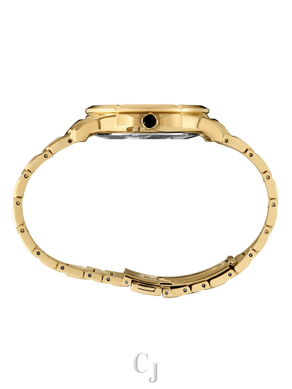 From the Coutura Collection. Delivering the perfect blend of edge and elegance for those on the move, the Coutura Collection combines bold angularity and shading with superior timekeeping for effortless sport/dress style. Inspired by motor sports, with a case and bracelet design incorporating the angles and edges of racecar architecture, this dashingly sculpted timepiece features a multi-layer carbon-fiber patterned black dial styled with applied indices for a rich dimensionality and includes a date calendar, red second hand, and LumiBrite hands and markers. Crafted of stainless steel with gold finish, this dynamic watch is equipped with a scratch-resistant sapphire crystal, screwdown caseback, tri-fold push button release clasp and a cabochon crown for a truly tailored look. 10 bar, 100M Water Resistant.