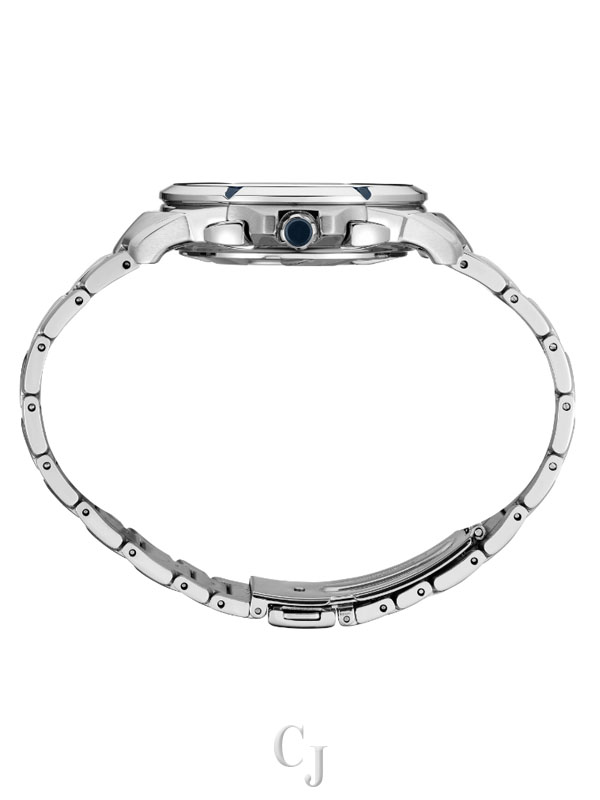 From the Coutura Collection. Delivering the perfect blend of technology and design for those on the move, the Coutura Collection combines bold angularity and shading with superior timekeeping for effortless sport/dress style. Inspired by motor sports, with a new case and bracelet design incorporating the angles and edges of racecar architecture, this dashingly sculpted chronograph features a multi-layer carbon-fiber patterned blue dial styled to suggest a dashboard, with prominent 24-hour and chronograph minute subdials at 3 and 9 o’clock, tachymeter outer ring, date calendar, orange chronograph hand, and LumiBrite hands and markers. Applied markers and subdial rings add a rich dimensionality, while the blue accents punctuating the bezel provide a sense of propulsive action. Crafted of stainless steel, this dynamic watch includes a sapphire crystal, screwdown caseback, tri-fold push button release clasp and classic cabochon crown. The chronograph function offers timing to 60 minutes in 1/5-second increments with split time measurement. 10 bar, 100M Water Resistant