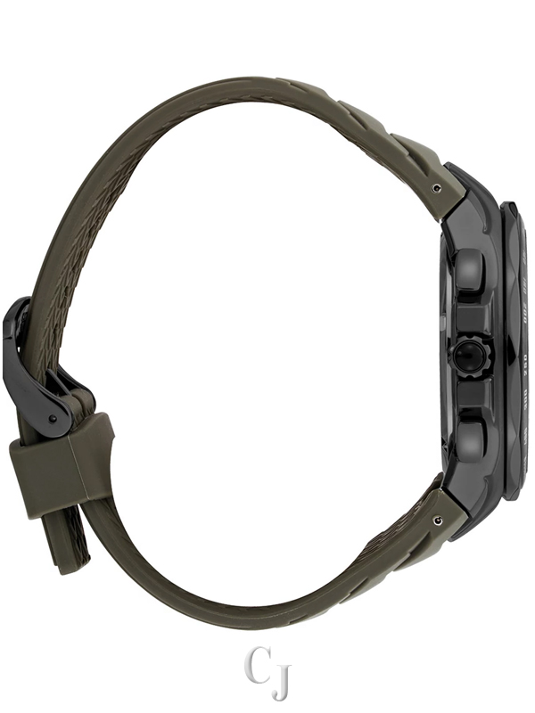 Black ion-plated stainless steel case with a green silicone strap. Fixed black ion-plated bezel with an inlaid black ring showing tachymeter markings. Green camouflage dial with luminous silver-tone hands and index hour markers. Minute markers around the outer rim. Dial Type: Analog. Luminescent hands and markers. Date display between the 4 and 5 o’clock positions. Chronograph – three sub-dials displaying: 60 second, 60 minute and 24 hours. power reserve display. Seiko caliber V192 quartz movement with a 6 months power reserve. Scratch resistant sapphire crystal. Pull / push crown. Solid case back. Round case shape. Case size: 45.5 mm. Case thickness: 12.3 mm. Band width: 20 mm. Tang clasp. Water resistant at 100 meters / 330 feet. Functions: chronograph, tachymeter, date, hour, minute, second, power reserve. Coutura Series. Casual watch style. Seiko Coutura Chronograph Quartz Green Camouflage Dial Men’s Watch SSC747