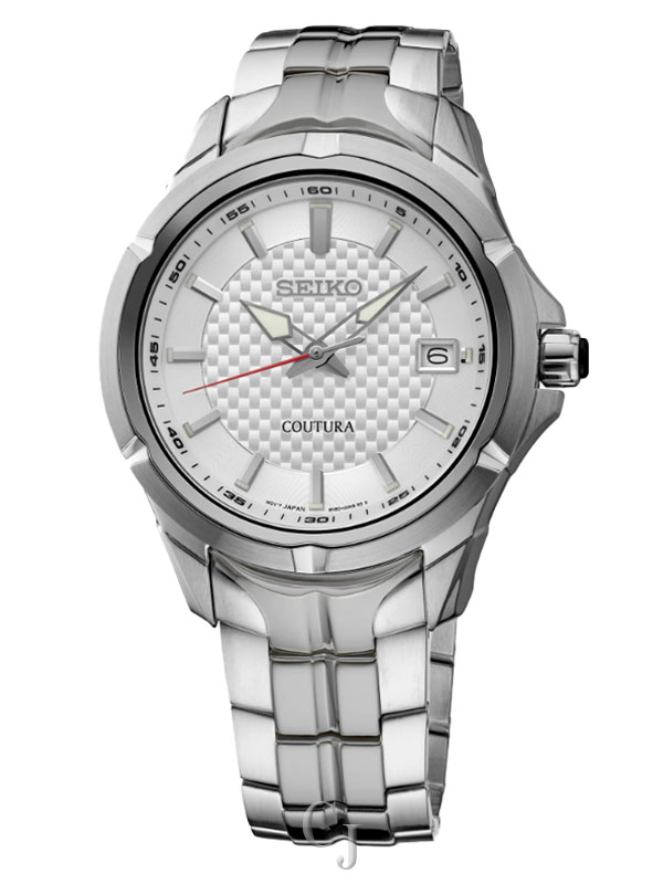 From the Coutura Collection. Delivering the perfect blend of edge and elegance for those on the move, the Coutura Collection combines bold angularity and shading with superior timekeeping for effortless sport/dress style. Inspired by motor sports, with a case and bracelet design incorporating the angles and edges of racecar architecture, this dashingly sculpted timepiece features a multi-layer carbon-fiber patterned silver dial styled with applied indices for a rich dimensionality and includes a date calendar, red second hand, and LumiBrite hands and markers. Crafted of stainless steel, this dynamic watch is equipped with a scratch-resistant sapphire crystal, screwdown caseback, tri-fold push button release clasp and a cabochon crown for a truly tailored look. 10 bar, 100M Water Resistant.