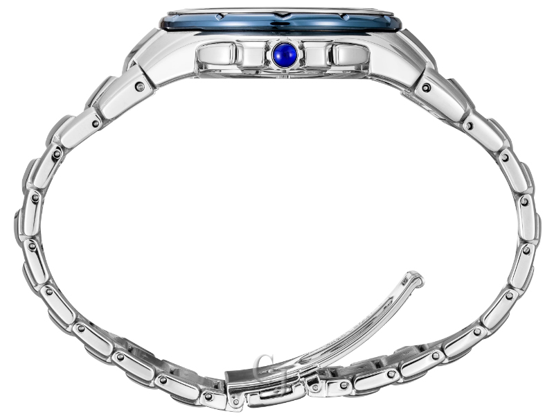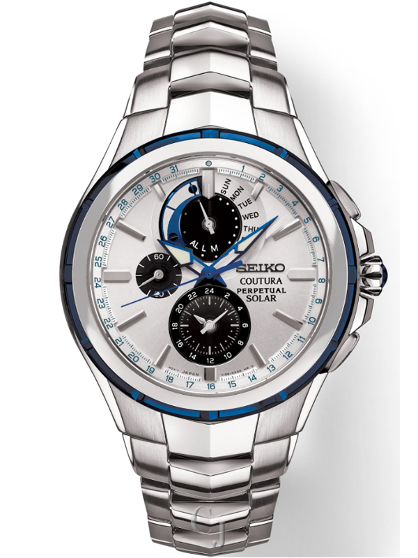 From the Coutura Collection, Solar perpetual calendar alarm chronograph, Powered by light energy – no battery change required, 6-month power reserve once fully charged, Perpetual calendar adjusts for odd and even months, including leap years, until 2100, Chronograph measures up to 60 minutes of elapsed time in 1/5-second increments with split time measurement function, Alarm function, Silver sunray dial with blue subdials and accents, Power reserve indicator, Leap year, month, day and date indicator, 24-hour subdial, LumiBrite hands and markers, Sapphire crystal, Bezel with blue ion finish, Screwdown caseback, Case diameter: 44.0mm, Stainless steel case and bracelet, Cabochon crown, Water-resistant to 10 bar, 100 meters (330 feet), Caliber V198