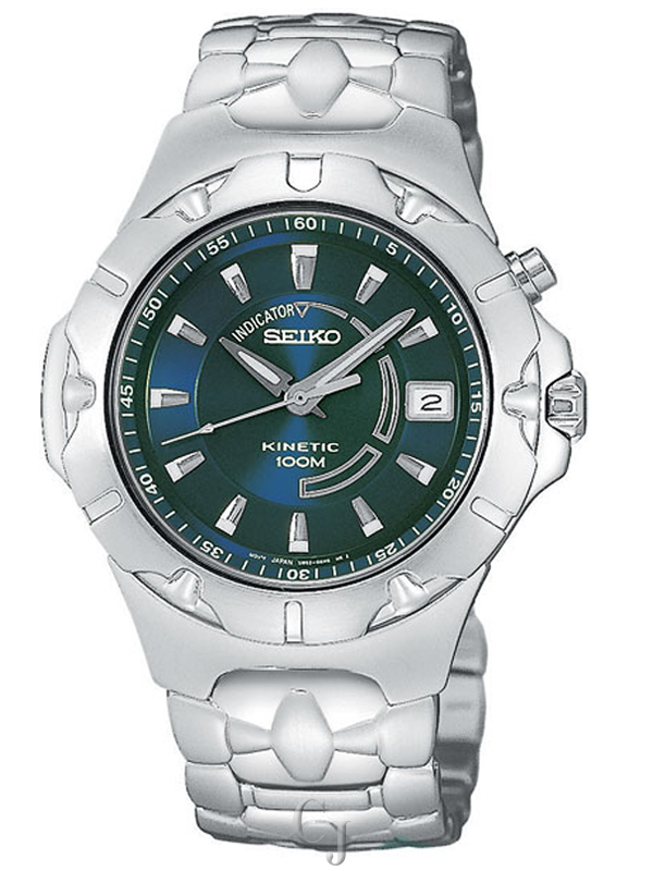 Stylish and technologically advanced, the kinetic Seiko SKA193 silver stainless steel men’s watch contains its own internal electrical generator–operated by natural wrist movements–making it independent of conventional storage batteries. The step-motion second hand will move in 2-second intervals when energy is reaching a level of less than 3 hours. It features a large, round watch case that measures 1.7 inches in diameter and a distinctive bezel with scalloped and cut-out accents.