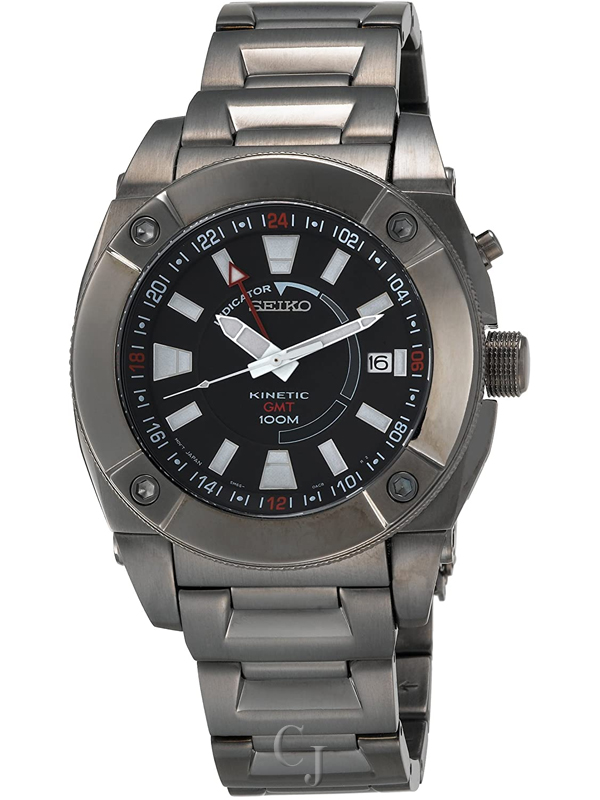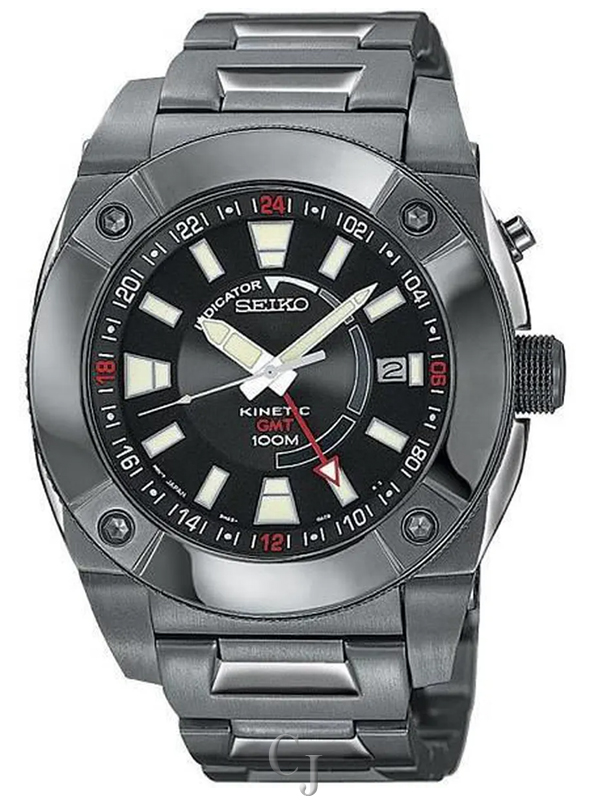 Contemporary styling with advanced technological features, this GMT flight computer features Seiko?s Kinetic technology; By the simple movement of your wrist, the rechargable battery charges itself. Once fully charged, it captures and stores energy up to six months. Kinetic- the most advanced electronic watch technology. . Features include- Black Ion Finish case and bracelet, black dial with date display and screwdown see thru caseback. 100 meters water resistant.