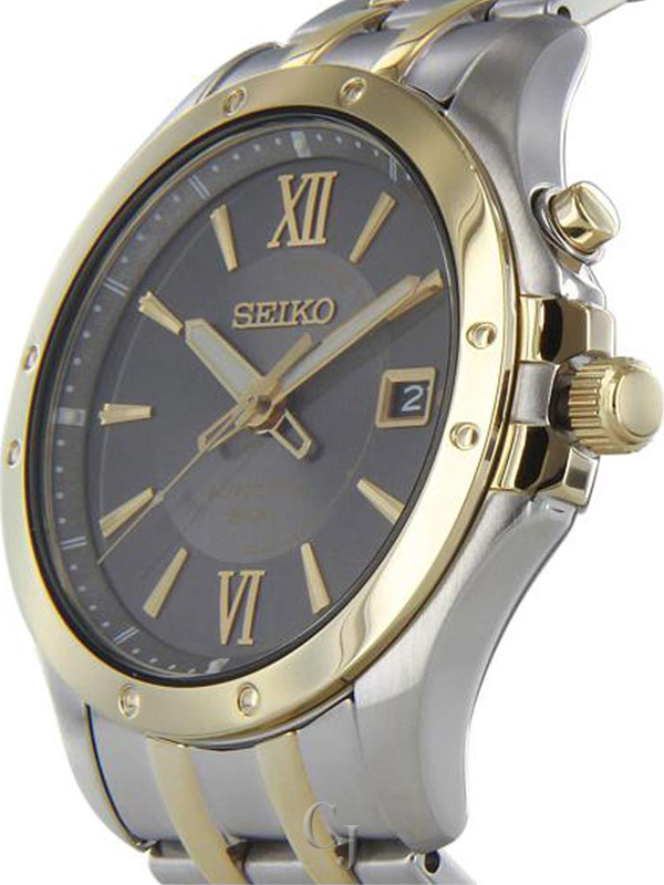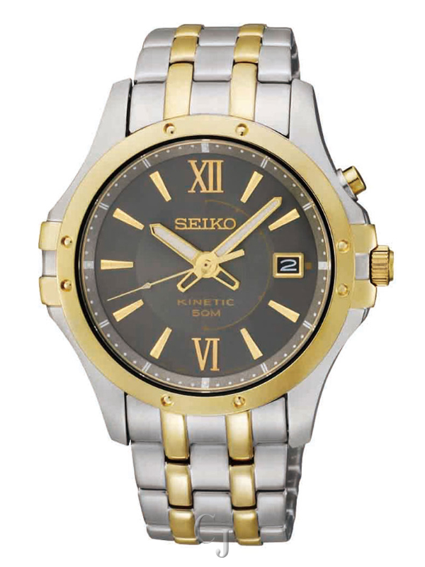 Seiko SKA550 Le Grand Sport Kinetic men’s watch features a 41mm wide and 12mm thick two tone yellow gold plated solid stainless steel case with a fixed bezel and textured push-pull crown with a function pusher. Seiko SKA550 is powered by an accurate Japanese 5M62 Kinetic movement (powered by the movement of your body). This stylish watch also features a textured grey dial with white accents gold tone luminous hands and index hour markers along with the 6-month power reserve and date display functions, scratch resistant hardlex crystal and water resistant to 50 meters. Seiko SKA550 is equipped with a 19mm wide two tone yellow gold plated solid stainless steel bracelet with a fold over push-button clasp. Seiko SKA550 men’s Le Grand Sport Kinetic power reserve grey dial two tone steel watch