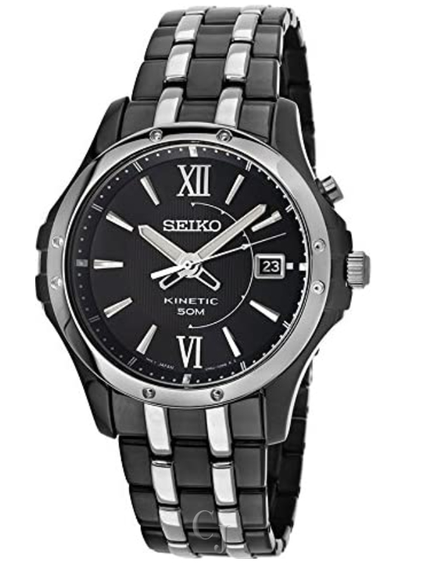 Stainless steel case with a two-tone (silver and black ion-plated ) stainless bracelet. Fixed silver-tone bezel. Black dial with silver-tone hands and index hour markers. Roman numerals mark the 6 and 12 o’clock positions. Minute markers around the outer rim. Dial Type: Analog. Luminescent hands and markers. Date display at the 3 o’clock position. Quartz movement. Scratch resistant Hardlex crystal. Screw down crown. Skeleton case back. Case diameter: 41 mm. Case thickness: 12 mm. Round case shape. Band width: 32 mm. Deployment clasp with push button release. Water resistant at 50 meters / 165 feet. Functions: date, hour, minute, second. Casual watch style. Watch label: Swiss Made. Seiko Kinetic Black Dial Two-tone Stainless Steel Men’s Watch SKA551.