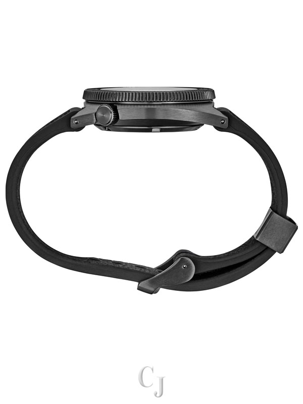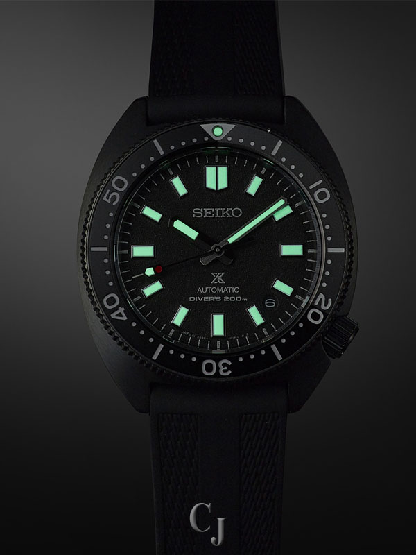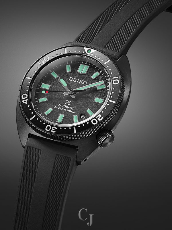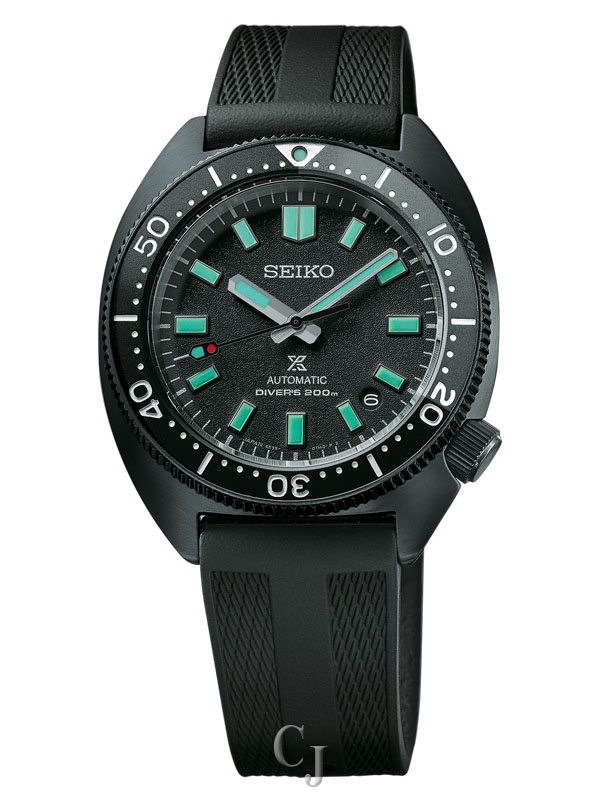 Prospex Black Series Limited Edition. Designed for those who treat life as the ultimate adventure, the Seiko Prospex line meets every challenge with technological excellence and style. Part of a rich legacy of innovation in high-intensity timekeeping, Prospex continues to celebrate a long history of sports watch excellence with re-creations and re-interpretations of landmark achievements. Based on an iconic design, this extraordinary Black Series Limited Edition, available only in a controlled production run of 4,500 with the serial number engraved on each caseback, expresses the view seen through a night vision scope, and features hands and markers with Seiko’s brighter and longer lasting “Green LumiBrite Pro,” suitable for professional usage and providing maximum visibility with the color most recognizable in the dark. Following ISO standards for scuba diving to depths of up to 200 meters, this exceptional timepiece includes a 24-jewel automatic movement with a frequency of 21,600 vibrations per hour, a power reserve of approximately 70 hours and manual winding capability. With Seiko’s thinnest mechanical diver’s watch case, in stainless steel with black hard coating, this dramatic watch includes a black dial, date calendar, curved sapphire crystal with anti-reflective coating on the inner surface, screwdown crown and caseback, black uni-directional rotating elapsed timing bezel and black silicone strap. 200m Water Resistant.