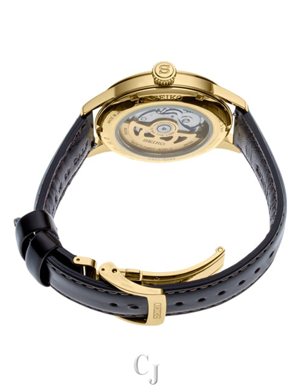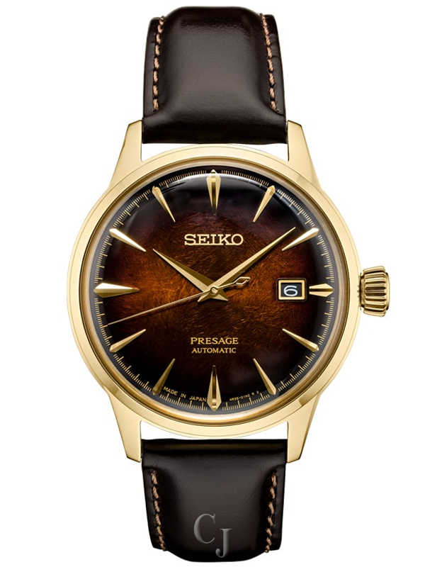 - This Limited Edition (8,000) Seiko Presage watch features a dark brown/burgundy glossy dial, a 4R35 caliber 23-jewel automatic movement, a stainless steel case with a gold finish, smooth brown leather strap with contrast stitching, an exhibition back, and a box-shaped crystal.
