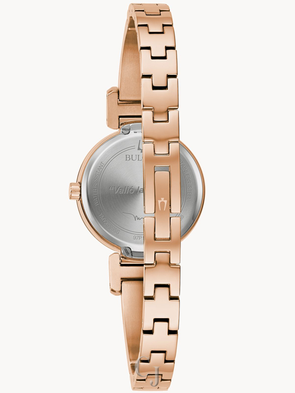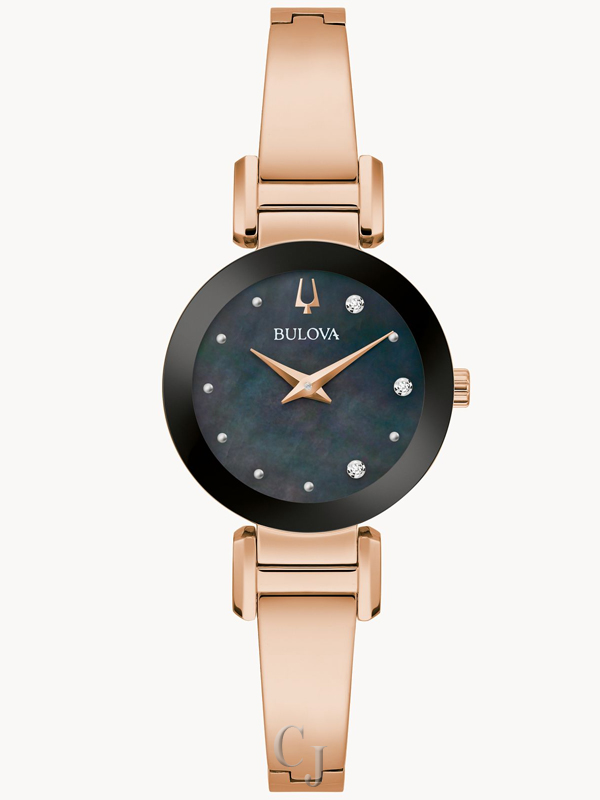 Bring the romance of Marc Anthony’s music to the wrist in this essential accessory that unites Bulova’s fine watchmaking and Marc Anthony’s iconic music in an exclusive collaboration. The new Bulova Marc Anthony Modern Bangle ladies’ watch highlights Bulova’s timeless design with a touch of Anthony’s styling. The rose gold-tone stainless steel case features bold contemporary lines and has a black metalized mineral crystal that extends to the edge for a seamless silhouette. A black mother-of-pearl dial is accented with three diamond hour markers at 1, 3, and 5 o’clock, numbers chosen by Anthony for their personal significance. The case back features an engraving chosen by Anthony: “Valió la Pena” (It was worth it.). A polished rose gold-tone stainless steel bangle bracelet is connected by unique faceted links, completing the striking look of this timepiece. Marc Anthony’s music transcends time, and this elegant, modern women’s watch from Bulova expresses a timeless style.
