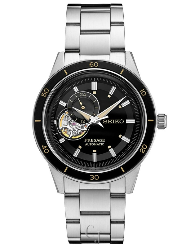 The Seiko Presage model SSA425 is a sporty dress watch with a fixed sixty minute marked bezel. It has a rich black dial offset with silver hands and hour markers. The hands are filled with Lumibrite as are white rectangular boxes next to select hour markers. A 24-hour sub-dial partially overlays the open-heart window on the dial. A Hardlex crystal adds clarity and presence to the beautiful dial.