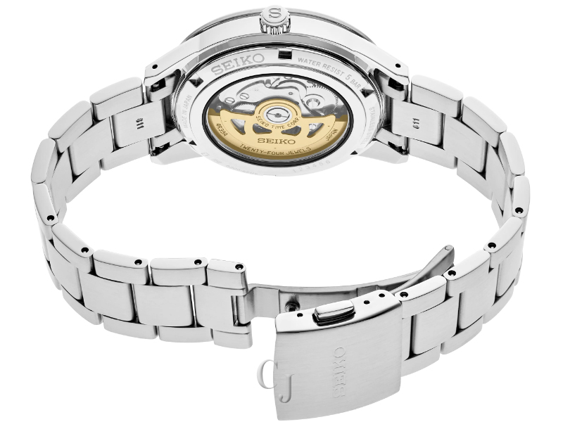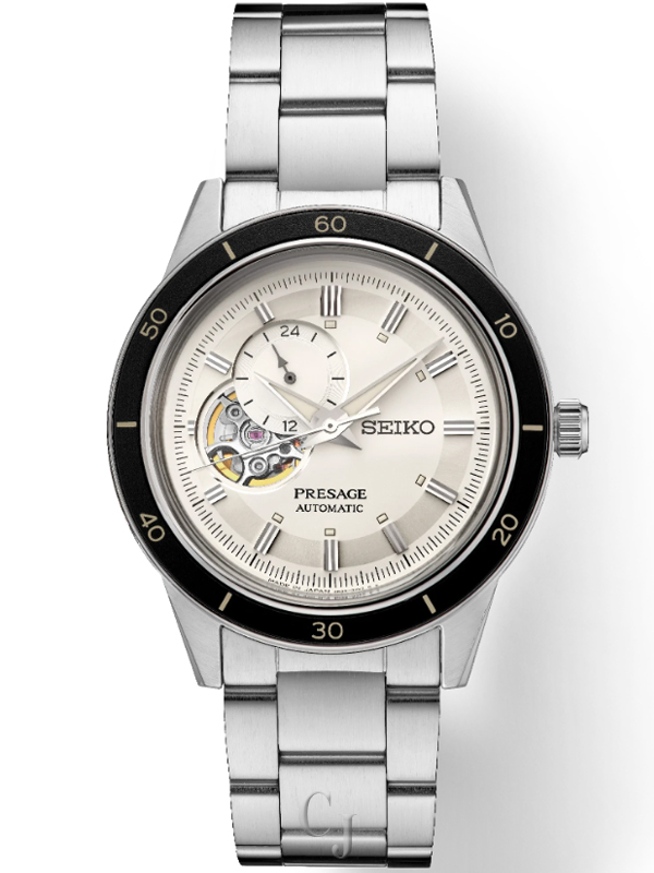Presage Style ’60s Collection, Inspired by the styles of the 1960s, including the 1964 “Crown Chronograph,” Japan’s first watch with a stopwatch function, Fine mechanical watchmaking from Japan, Automatic with manual winding capability, 21,600 vibrations per hour, Power reserve: approximately 41 hours, 24 jewels, Light beige open-aperture dial, 24-hour subdial, LumiBrite hands and markers, Box-shaped crystal, Black bezel, Screwdown see-through caseback, Case diameter: 40.8mm, Stainless steel case and bracelet, Tri-fold push button release clasp, Water-resistant to 5 bar, 50 meters (165 feet), Caliber 4R39