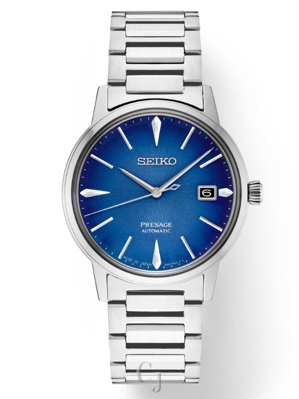 Seiko Presage Cocktail Time. Offering the finest in Japanese mechanical watchmaking, the Presage Collection blends precision technology with superior craftsmanship and design. Inspired by the vibrance of the city’s modern lounges, the newest Cocktail Time designs express the excitement of today’s Tokyo, with fresh styling and colors. Highlighted by a vivid blue dial with gradated tones, pressed pattern and gloss finish evoking the Aviation cocktail, this elegant design features a 23-jewel automatic movement, with manual winding capability, that beats at a frequency of 21,600 vibrations per hour, with a power reserve of approximately 41 hours. Crafted of stainless steel, this distinctive timepiece includes a calendar, box-shaped crystal, screwdown see-through caseback and double deployment clasp with push button release. 5 bar, 50M Water Resistant.