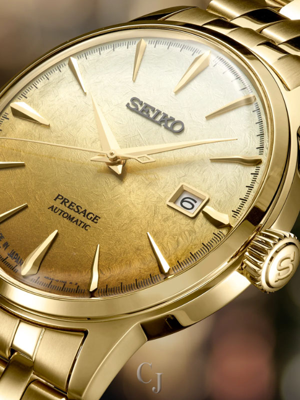 Seiko Presage Cocktail Time U.S. Special Creation now available in select markets globally. Offering the finest in Japanese mechanical watchmaking, the Presage Collection blends precision technology with superior craftsmanship and design. Celebrating craft beer cocktails, as one of the first two watches in the Cocktail Time Collection to offer a gold case and bracelet finish, this shimmering design, inspired by the Beer Julep cocktail, is highlighted by a gloss-finish gold dial with vertical gradations to suggest the sparkling hues of a fresh pour and a pressed pattern to evoke its bubbling effervescence. The 23-jewel automatic movement, visible through the screwdown see-through caseback, beats at a frequency of 21,600 vibrations per hour, with a power reserve of approximately 41 hours and manual winding capability. Crafted of stainless steel, this distinctive timepiece includes a calendar, box-shaped crystal, and deployment clasp with push button release. 5 bar, 50M Water Resistant