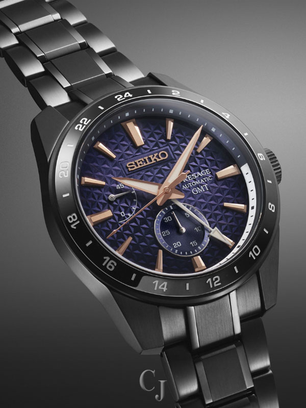 Presage Sharp-Edged Series GMT Limited Edition. Offering the finest in Japanese mechanical watchmaking, the Presage Collection blends precision technology with superior craftsmanship and design. Joining the coolly angular Sharp-Edged Series, celebrating the fresh look of contemporary Japanese design, this exceptional Limited Edition is available only in a controlled production run of 2,000 with the serial number engraved on each caseback. Expressing “Akebono,” the dawn, with its sense of new expectations, this stunning timepiece is inspired by the morning twilight, as the sky brightens with the sunrise. The three-dimensional, gloss coated, multi-layered dial, in rich gradated sapphire blue, framed by a black GMT bezel, includes rose gold accents to suggest the first glimmers of sun, as does the sharp sunray-like form of the markers and second hand. With 24-hour GMT hand, power reserve indicator, date display, and LumiBrite hands and markers, the dial also features the Presage Sharp-Edged Series’ Asanoha hemp-leaf motif, a symbol of growth and prosperity dating to the Heian Period (794-1185 AD). Crafted of stainless steel, with black hard coating, this extraordinary watch offers a 29-jewel automatic movement, with GMT complication, visible through the screwdown, see-through caseback, that beats at a frequency of 28,800 vibrations per hour, with a power reserve of approximately 45 hours and manual winding capability. A sapphire crystal features anti-reflective coating on the inner surface, while the tri-fold push button release clasp provides secure and comfortable wear. 10 bar, 100M Water Resistant.