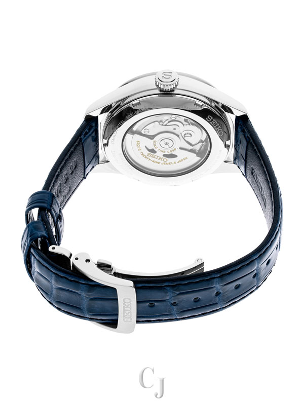 Presage Arita Porcelain Limited Edition. Offering the finest in Japanese mechanical watchmaking, the Presage Collection blends precision technology with superior craftsmanship and design. Inspired by Suigetsu, the Heian Period (794-1185 AD) noble tradition of viewing the moon through its reflection on ponds and sake cups, this exceptional watch is available only in a limited edition of 2,000, with serial number on each caseback. Handcrafted by master artisans in a unique snow-white color with gloss finish, the Arita porcelain dial features a power reserve indicator and calendar subdial. Completing the moon imagery are the finely crafted blue hands and markers as well as the light blue crocodile strap with tri-fold push button release clasp. A dual-curved sapphire crystal offers anti-reflective coating on the inner surface, while the screwdown see-through caseback provides a view of the 29-jewel automatic movement with manual winding capability, a frequency of 28,800 vibrations per hour and a power reserve of approximately 45 hours. Crafted of stainless steel. 10 bar, 100M Water Resistant.