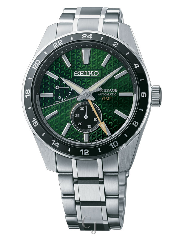 Presage Sharp-Edged Series GMT. Offering the finest in Japanese mechanical watchmaking, the Presage Collection blends precision technology with superior craftsmanship and design. Known for unique dials reflecting centuries of artistry, Presage embraces the fresh look of contemporary Japanese design with this coolly angular timepiece. The theme of energy is captured by the intricate dial pattern, based on the traditional Asanoha hemp leaf motif of the Heian Period (794-1185 AD), a symbol of growth and prosperity. Uniquely shaped LumiBrite hands and stick markers add a crisp legibility to the Tokiwa green GMT dial, with 24-hour GMT hand, power reserve indicator and date display. A sapphire crystal includes anti-reflective coating on the inner surface, while the screwdown see-through caseback provides a view of the caliber 6R64 29-jewel automatic movement with manual winding capability, a frequency of 28,800 vibrations per hour and a power reserve of approximately 45 hours. With clean, sharp angles to highlight the beauty of the material, this bracingly modern watch is crafted of stainless steel with super-hard coating and tri-fold push button release clasp. 10 bar, 100M Water Resistant.