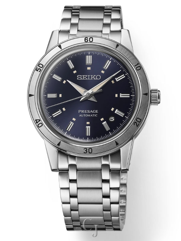 Presage Style60’s Collection. Celebrating the fresh spirit of the 1960s, this design is an homage to Seiko’s 1964 “Crown Chronograph,” combining a bold ruggedness with a refined and tailored style. Framed by a metallic bezel with laser engraved details, the sunray finish dial inherits the layout of the original model with a blue color inspired by vintage work jackets. The faceted indices are polished for an elegant shine, enhanced by the stainless steel case and box shaped crystal, providing beautiful dimensionality. Visible underneath the screwdown see-through caseback, the 23-jewel automatic movement beats at a frequency of 21,600 vibrations per hour and offers manual winding capability with a power reserve of approximately 41 hours. Crafted of stainless steel, this versatile timepiece features a sophisticated multi-row bracelet, tri-fold push button release clasp, a date calendar and LumiBrite hands and markers for superior visibility. 5 bar, 50M Water Resistant.