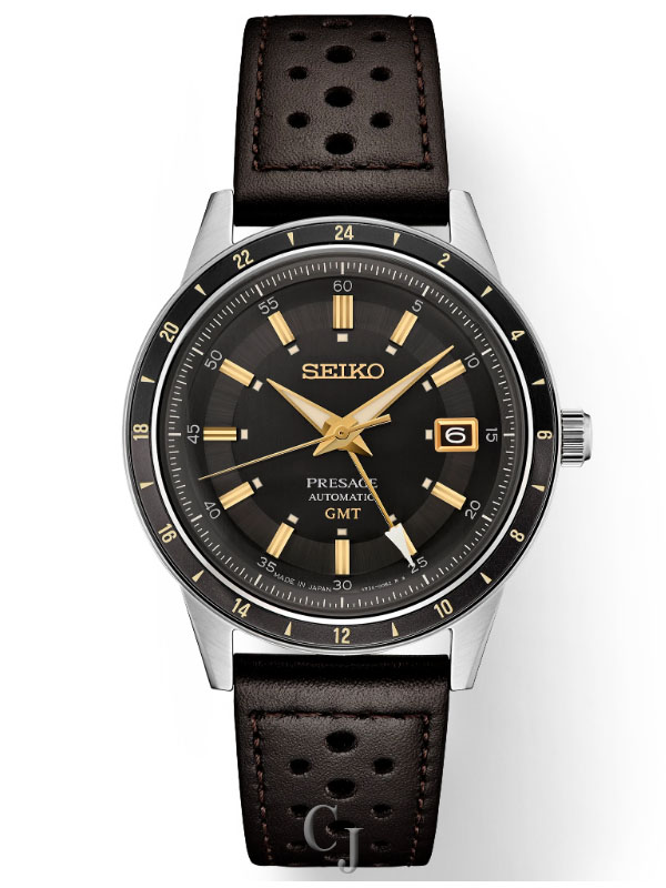 Presage Style60’s GMT. Offering the finest in Japanese mechanical watchmaking, the Presage Collection blends precision technology with superior craftsmanship and design. Inspired by the steering wheel, levers, instruments and metallic colors of vintage 1960s touring cars, the Style60’s GMT models create a distinctive retro feel with broad angular lines, box-shaped crystals, faceted indices and sharp hand design. Celebrating the spirit of the decade, the collection incorporates dial elements from Seiko’s 1964 “Crown Chronograph,” Japan’s first watch with a stopwatch function. Framed by a black and dark gray 24-hour GMT bezel, the dark brown-gray dial features gold accents, a date calendar, a GMT hand, and LumiBrite hands and markers. The screwdown see-through caseback provides a view of the 24-jewel movement with manual winding capability, a frequency of 21,600 vibrations per hour and a power reserve of approximately 41 hours. Crafted of stainless steel, in a new hairline finish suggesting the metallic, machine-like feel of ’60s cars, this memorable timepiece includes a brown perforated leather strap echoing classic interior elements. 10 bar, 100M Water Resistant.