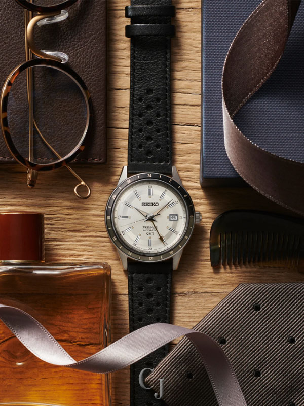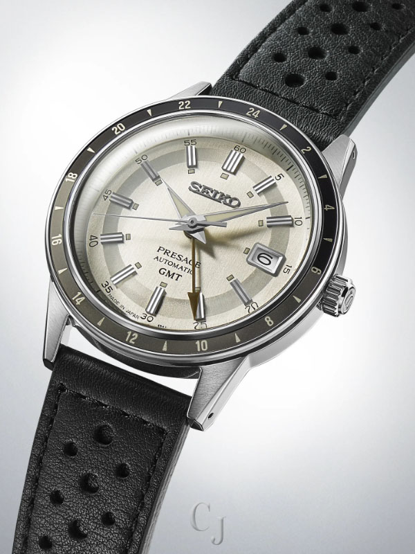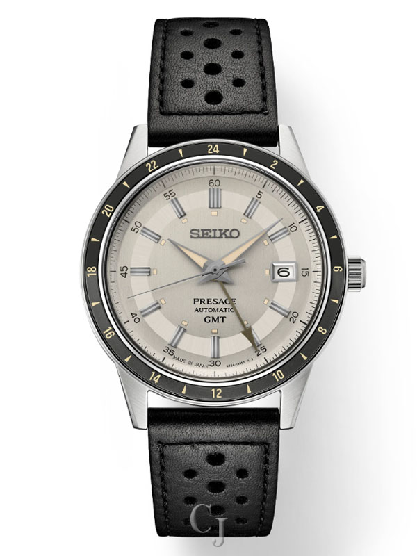 Presage Style60’s GMT. Offering the finest in Japanese mechanical watchmaking, the Presage Collection blends precision technology with superior craftsmanship and design. Inspired by the steering wheel, levers, instruments and metallic colors of vintage 1960s touring cars, the Style60’s GMT models create a distinctive retro feel with broad angular lines, box-shaped crystals, faceted indices and sharp hand design. Celebrating the spirit of the decade, the collection incorporates dial elements from Seiko’s 1964 “Crown Chronograph,” Japan’s first watch with a stopwatch function. Framed by a black and dark gray 24-hour GMT bezel, the ivory dial features a date calendar and GMT hand, as well as LumiBrite hands and markers. The screwdown see-through caseback provides a view of the 24-jewel movement with manual winding capability, a frequency of 21,600 vibrations per hour and a power reserve of approximately 41 hours. Crafted of stainless steel, in a new hairline finish suggesting the metallic, machine-like feel of ’60s cars, this memorable timepiece includes a black perforated leather strap echoing classic interior elements. 10 bar, 100M Water Resistant.