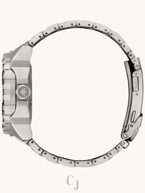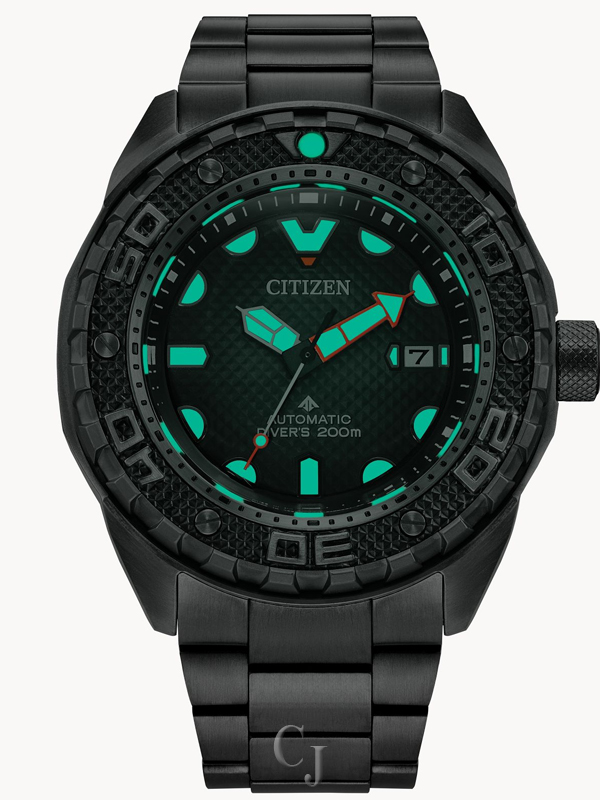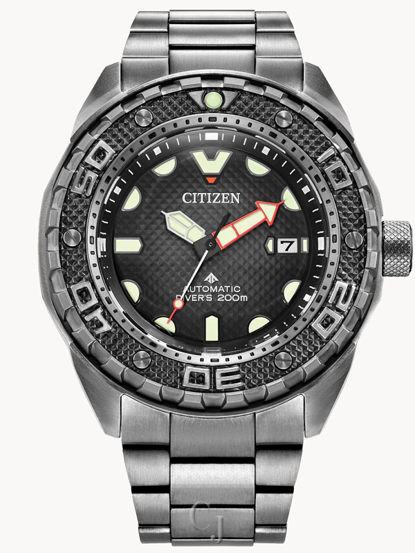 Submerge yourself in a new collection of Automatic Dive watches with a deep connection to Citizen’s history of innovation and proprietary technology. The new Promaster Automatic Diver 200M watch features Citizen’s Super Titanium™ construction that is both lightweight and ultra-durable. The bezel has angled tabs for an easy grip, and both the bezel and dial have a pyramid stud design that surrounds an anti-reflective, dual-sphere sapphire crystal and the black dial contrasts nicely with the titanium case and bracelet for a strong aesthetic of sport style and performance. Powered by the movement of your wrist, this advanced automatic watch features a 42-hour power reserve and large applied luminous hands and markers to give you an easy read in the dark or underwater. It comes in an exclusive collector’s tank box and is ISO compliant with a screw-down crown and water resistant to 200 meters. Caliber 9051.