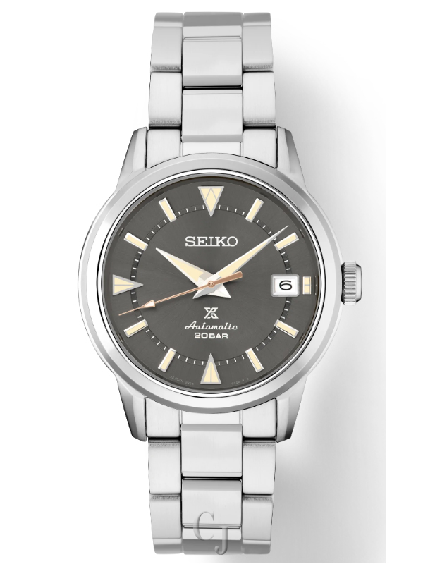 The Seiko PROSPEX Collection, from the LUXE line, has introduced a sleek new modern reinterpretation of the 1959 Alpinist wrist watch, paying homage to its pasts with this updated sport watch. The SRB243 automatic wrist watch does have a 200 meter water resistance rating with a stainless steel screwed down crown to protect against dirt and moisture intrusion. The 38mm stainless steel case has a charcoal grey sunray patterned dial with a minutes track behind LumiBrite indices accented with triangle mountain shaped markers. Equipped with an inconspicuous date window @3 with luminous sword style hands behind a curved anti-reflective sapphire crystal. Powered by Seiko’s own in-house movement caliber 6R35 is viewable behind the mineral crystal exhibition case-back with an impressive 70 hour power reserve capacity. Fitted with a brushed and polished 3-link stainless steel bracelet with a butterfly tri-fold push button safety clasp adjustable by two settings will keep your watch secure and in place.