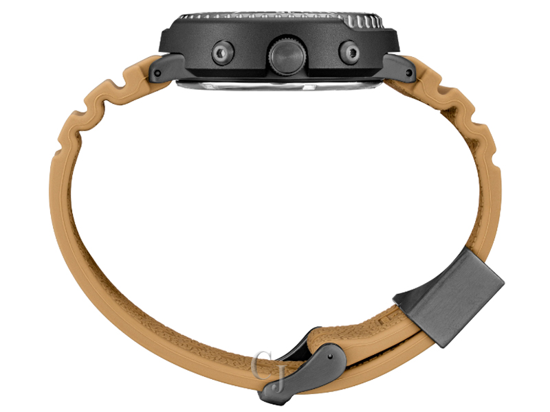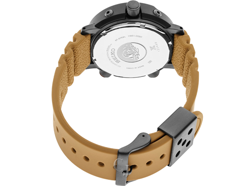 The black aesthetic looks striking on the wrist and fastens comfortably by a soft tan matching silicon strap. The case of the SNJ029 watch measures to 47.5mm in size, a slight increase from the original, and it is crafted from polished stainless steel. The largest difference between the new Seiko SNJ029 Solar Arnie and the original is the movement. The H558 model was powered by a standard quartz calibre whereas this new Seiko Arnie watch is equipped with Seiko’s famous Solar H851 movement with a six month power reserve when fully charged (by strong light). The H851 movement equips the timepiece with chronograph function, alarm, calendar and dual time. The functions are presented beautifully beneath hardlex crystal glass by a digital display and luminous hands and indices.
