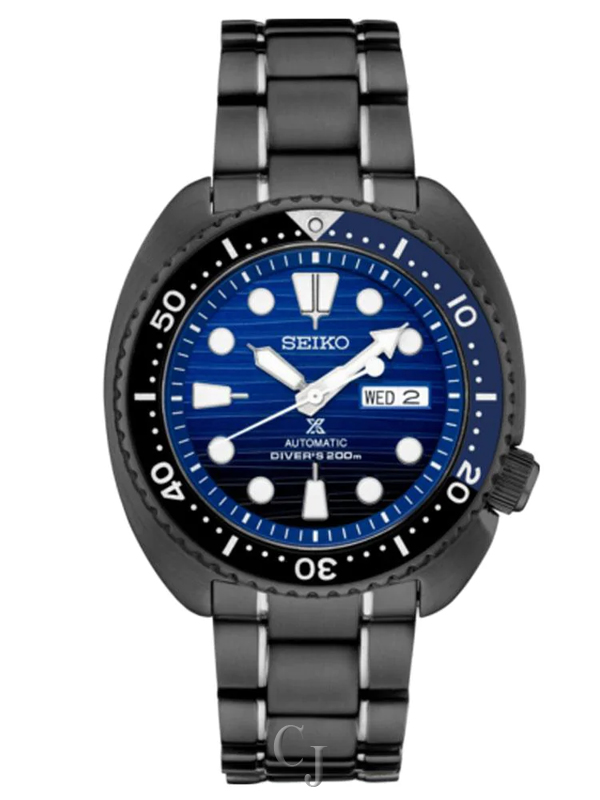Blue dial enhanced by luminous silver-tone arrow-shaped hands. Black Ion-plated stainless steel case with a black ion-plated stainless steel band. Automatic movement. 200 meters / 660 feet water resistance. Uni-directional Rotating bezel. Scratch Resistant Hardlex crystal. Solid caseback. Fold Over with Push Button Release clasp. Screw Down crown. Case size 45 mm x 13.3 mm. Band 22 mm x long. Seiko SRPD11 Prospex Watch.