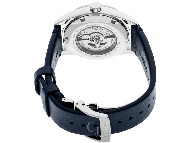 1959 Sport Watch Reinterpretation, Manual and automatic winding capabilities, 21,600 vibrations per hour, Power reserve: approximately 70 hours, 24 jewels, Gradated blue dial, Date calendar, LumiBrite hands and markers, Curved sapphire crystal with anti-reflective coating on the inner surface, Screwdown crown and see-through caseback, Case diameter: 38.0mm, Stainless steel case, Blue leather strap, Tri-fold clasp with push button release, Water-resistant to 20 bar, 200 meters (660 feet), Caliber 6R35